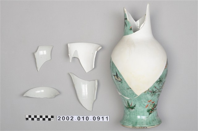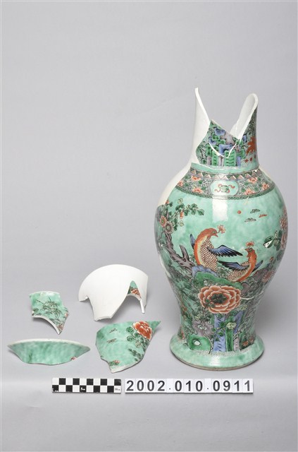 本件綠地鳳凰彩瓷瓶為釉上彩瓷器,先以高溫燒製出潔白帶釉之瓶身,於表面以各種鮮豔色彩繪製圖案,再以低溫燒結釉料。器形作圓形侈口,滑肩鼓腹,腰部漸收,底緣略為外侈。瓷器表面皆以淺綠色釉為地,頸部彩繪奇石花卉,器身以紅色成對之鳳凰為主角,前方以盛開牡丹背面為景,且以奇石、梅樹、蝴蝶、菊花等帶有吉祥含意之圖紋裝飾。本件藏品為921大地震後,從傾毀之敦本堂搶救出來的文物,為破碎殘件經石膏修復後,器身正面尚堪完整,背面大面積缺失。