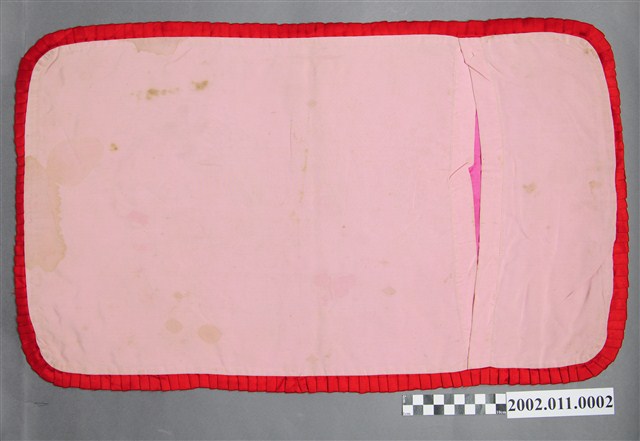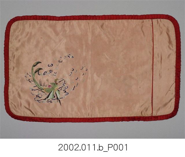 1.粉緞底鳳紋枕套,長59cm、寬35.5cm、高03cm,周邊以紅鍛作百摺包邊,背面有開口可放入枕芯。紋樣方面,僅在枕面右上方繡有飛翔的碧綠色鳳鳥,採用緞面繡,精細繡出鳳鳥羽毛的漸層顏色變化。鳳具有吉祥、富貴之意,多用於祝福女性。2.此件枕套為張慧芬於二十歲左右所繡,張女士出生於民國前一年(1911)。從紋樣以及畫面佈排,應與館藏登錄號2002.011.0001枕套為一對夫妻枕。從鳳紋來看,此件枕套應屬於女性使用。