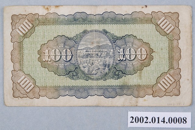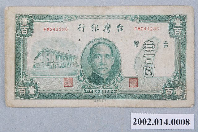 1.本物件為1946年臺灣銀行委託中央印製廠印製的臺幣壹百圓鈔券。以綠色為主墨色,採橫式印製,由幾何花紋構成鈔票圖案的方框,方框左上、右上兩角由上而下書寫「壹百」兩字,左下、右下兩角則是由右而左書寫「壹百」。方框內部上側左、右兩邊各印有編號FM241236,中間由右至左書寫「台灣銀行」等4字。方框內中間右側繪製臺灣地圖,臺灣地圖右上方書寫「台」字,左上邊書寫「幣」字,臺灣地圖圖案由上而下覆蓋「壹百圓」3字。中間左側繪製臺灣銀行總行建築。正中央繪製孫文肖像,肖像下方由右至左書寫「中華民國三十五年印」等9字。方框內下邊以花紋為底圖,花紋底圖右方為臺灣銀行董事長戳章,左方為臺灣銀行總經理戳章。方框邊界外下方中央由右而左書寫「中央印製廠」等5字。背面印製波浪型幾何花紋方框,方框四角各斜寫「100」數字,中央印製點狀直式橢圓形框,橢圓框內印鄭成功與荷蘭的海戰圖。橢圓框兩側各繪製略呈90度三角形幾何花紋底圖,底圖上有覆寫「100」數字。2.戰後初期臺灣省行政長官公署成立後,原暫時讓日治時期發行的臺灣銀行券流通,1946年6月,國民政府才正式授權臺灣銀行發行鈔券,並在5月22日委託中央印製廠上海廠印製壹圓、伍圓、拾圓等3種面額鈔券,再分批運來臺灣,9月1日,臺灣銀行再發行伍拾圓、壹百圓兩種面額紙鈔,仍委託中央印製廠製作。由於1949年臺灣省政府實行幣制改革,發行新臺幣,前此發行的貨幣於1950年1月14日正式停止流通。相較於新臺幣,幣制改革前發行的貨幣則慣稱為舊臺幣。本文物背面中央尚印製有鄭成功與荷蘭的海戰圖。
