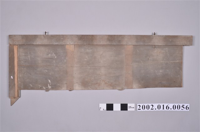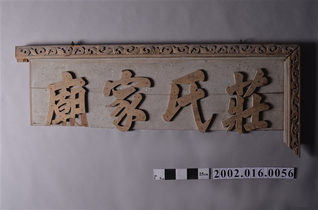 為莊氏家廟門樓及正身部分構件的匾額,上為「莊氏家廟」文字。匾額以木板相拼為底面,周圍木條以卡榫接合,上浮雕卷草紋。底板上另以板材雕「莊氏家廟」四字。四字後期以鐵釘固定於底板上。匾額正面邊框施金彩,字及底板原施彩,但大部分剝落。背面則施褐彩。本件下部破損不存。本件匾額為日本時代作法,但無法確定是否與建築同時雕造完成。上貼有「J-89」、「J-19-1」標籤。