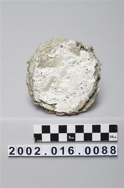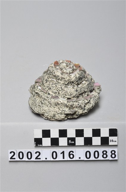 為莊氏家廟的剪黏裝飾局部,題材為花。剪黏是由鐵絲凹折為骨,上敷灰泥成坯體,再剪碗片等陶磁片嵌上,戶外部分多用於屋頂、懸魚,室內則用於水車堵、墀頭、牆堵等部位作為裝飾。本件剪黏的背面為灰泥平面,因此本件可能置於水車堵或脊肚等磚砌平面上。