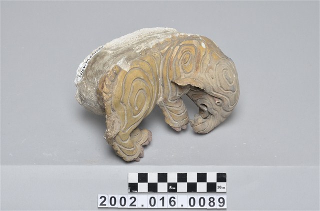 為莊氏家廟的交趾陶裝飾,題材為象。交趾陶是低溫釉燒陶,先以陶土塑形,上釉後入窯燒製而成,戶外部分多用於屋頂、懸魚,室內則用於水車堵、墀頭、牆堵等部位作為裝飾。因為於屋頂容易損壞,至日本時代多以剪黏置於屋頂,交趾陶則多用於室內部位。本件剪黏的背面為灰泥平面,因此本件可能置於水車堵或牆堵等磚砌平面上。