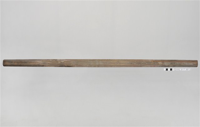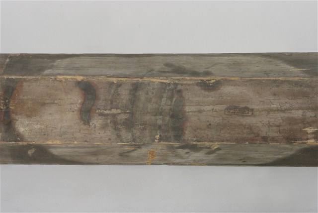 為臺中大里林大有宅燈樑,正面彩繪將樑身切分為三垛,繪製花鳥器物題材。本件燈樑架設於民宅正身公廳,通常兩端穿入牆體,斷面為六角形,是最常見形式。燈樑朝下面鎖鉤環五金,用以懸掛天公燈、宮燈或天公爐。宮燈傳統上於娶新娘、添丁時成對懸掛,後亦轉成保佑家族平安的姓氏燈意義。