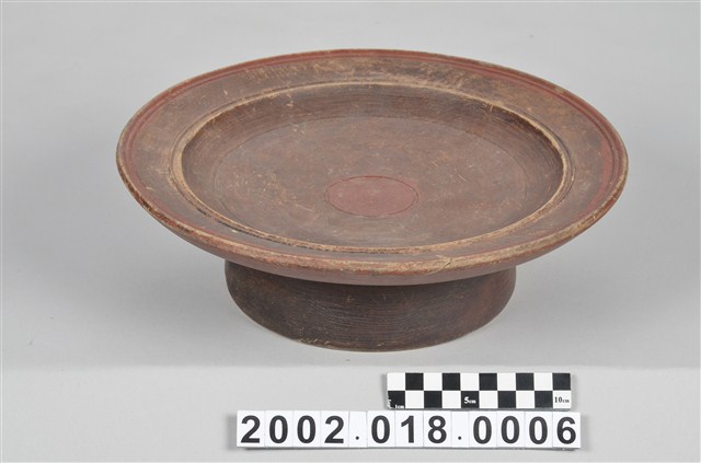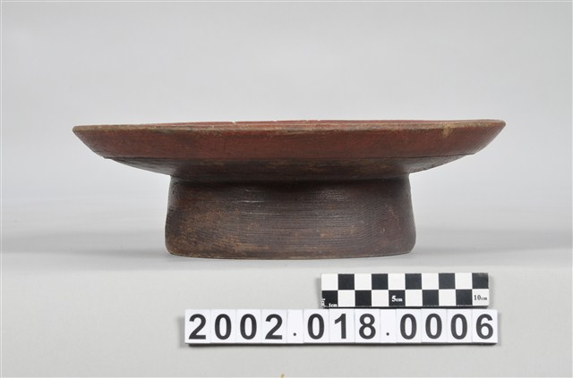 1.本件高腳供盤以單塊木頭刨削雕磨出一體成形的圓形木製盤子,盤正面口緣與盤心處塗以紅色漆,其餘則塗以棕色漆,用以防蛀與增添喜氣,整體結構完整,雕工簡單、樸拙。正面由外至內雕有六道圓線紋作為裝飾,背面有一道圓線紋裝飾。底部為中空圈柱狀的高足,周徑由盤面漸向足底擴大,以增加穩定性。因年代久遠與保存不良,褪色情況嚴重,盤面略為變形、脫漆,邊緣則有明顯磨損。裸露的木胎部分可看出由機器刨磨製成的痕跡。2.此類木料材質的高腳供盤又稱「豆盤」、「四果盤」。是臺灣早期社會在祭祀、節慶、下聘時置於供桌上用來擺放供品的器皿,供品通常是粿粄、水果、糖果蜜餞等,擺設時大都會放置以三至五盤為主。隨著時代發展,高腳供盤逐漸出現銅製、鋁製、不繡鋼製、塑膠製等,時至今日,常見的多為紅色塑膠材質。