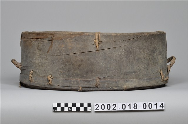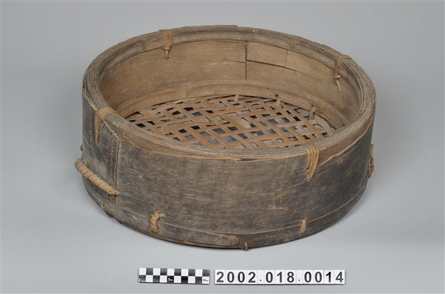 1.本件為大型圓形竹蒸籠的籠身。周身邊壁以薄竹片多層繞圍成圓筒狀,平削接合,上下口緣與邊壁接合處皆打洞以藤篾穿繞加固;左右兩側各有一穿孔繞編出的提耳;底部以竹篾採壓二挑二四角孔編,並以較粗竹條平行插紮在底部以增加承重力。因經久使用與年代久遠,籠身內外周身邊壁皆已有明顯破損裂痕與泛黑狀況。2.蒸籠為傳統蒸煮的食具,由於層蓋間蓋密合度佳、材質輕巧天然能夠吸收多餘水蒸氣,並且保持食物適當的含水量,蒸煮後的食物帶有木竹片的天然香味,相當普遍使用於過去台灣農業社會的一般家庭。使用時在燒水的鍋上,依照食物的多寡調整蒸籠層數,讓蒸氣通過蒸籠底板的孔隙來蒸熱、蒸熟食物。