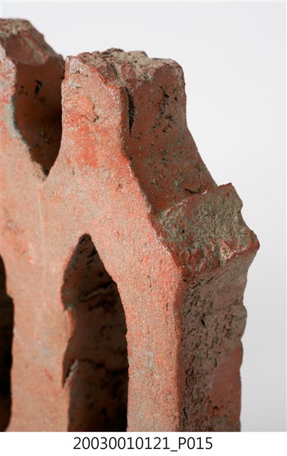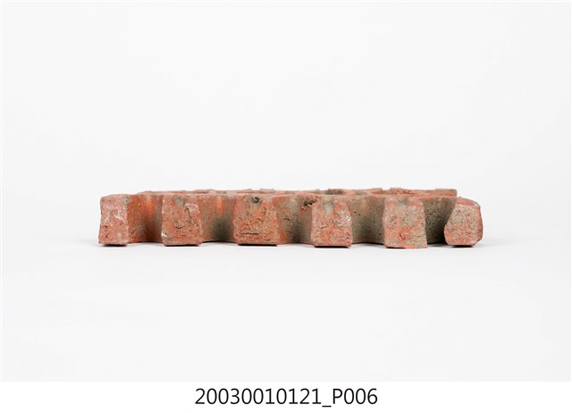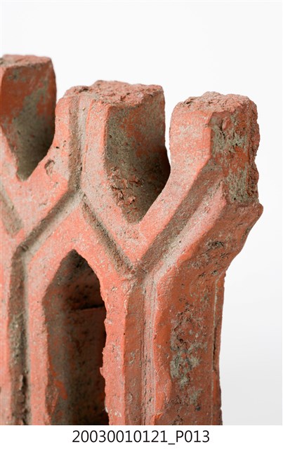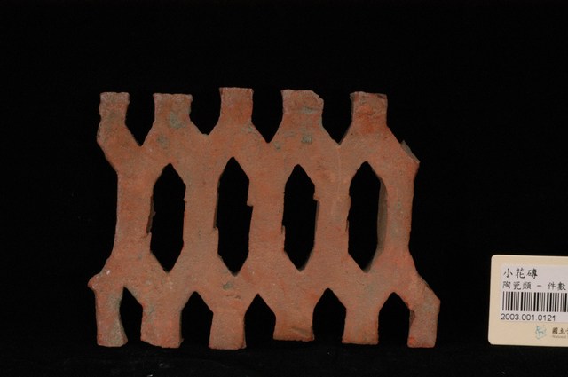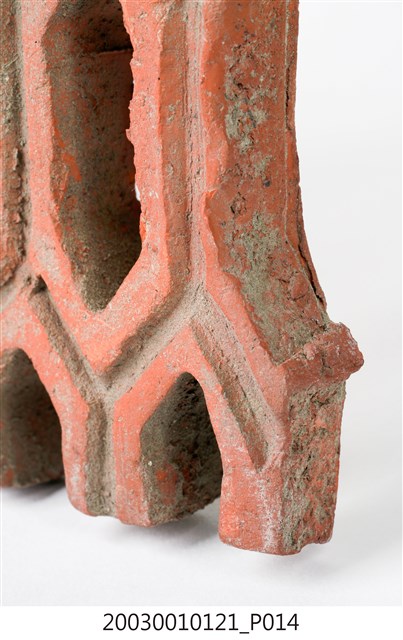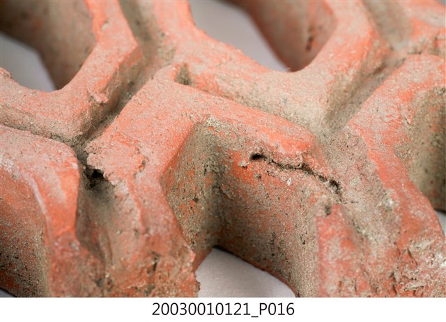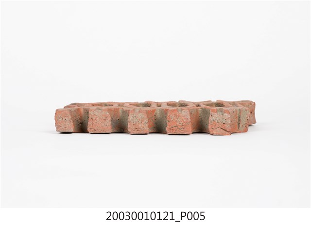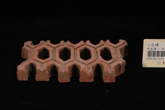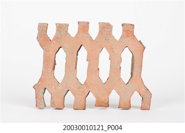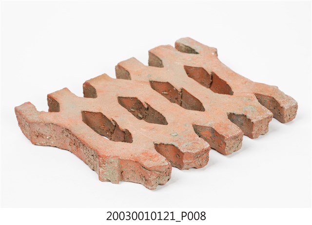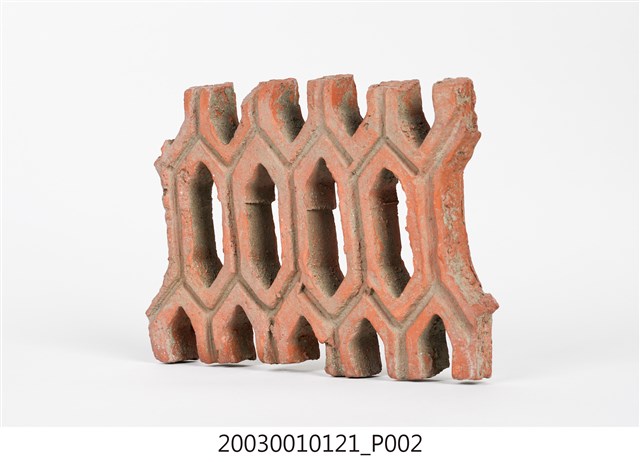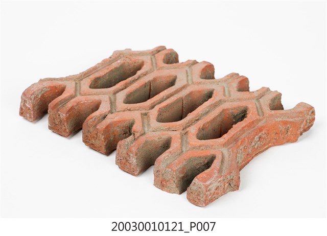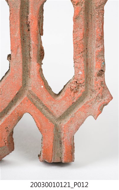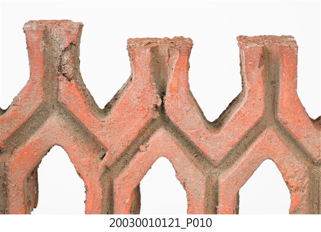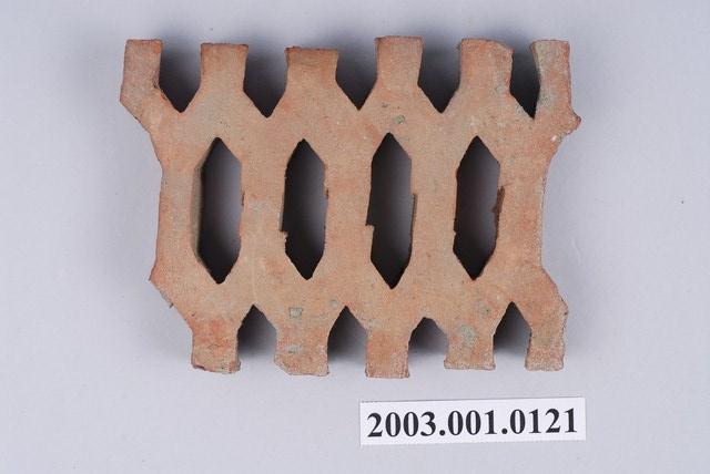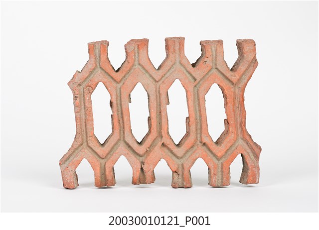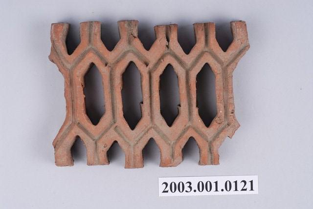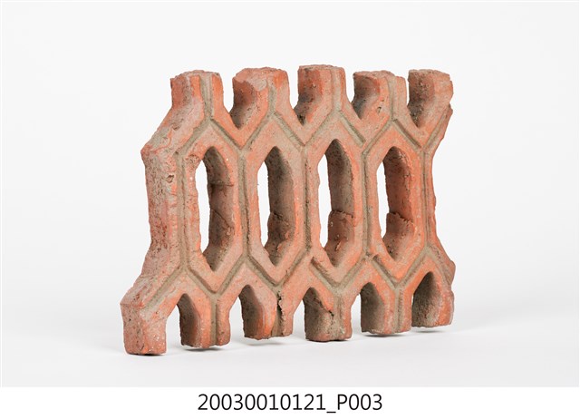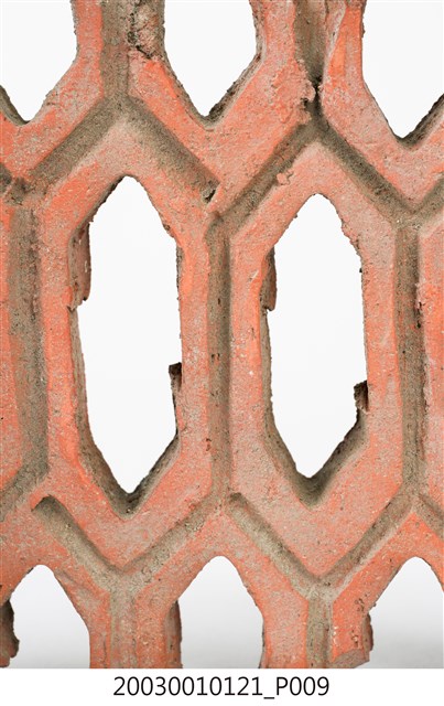 柳條磚取其線條似柳葉形而名之,又稱柳葉磚,是鏤空花磚的一種。為紅色素燒磚。最常見的是以中間三個相連的完整中空長六角形,兩側為半個長六角形組成,通常長寬各約15公分,本件為特殊尺寸,高度僅10公分。本件柳條磚中間為四個長六角形,正面有陰刻六角形線條。柳條磚用於漢式傳統廟宇或民居的氣窗或屋脊,可減輕屋脊重量或增加屋內的通風採光,通常以多塊並列,形成連續龜甲圖案。本件磚局部破損不存。