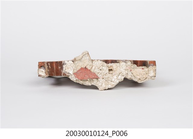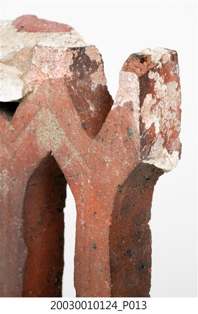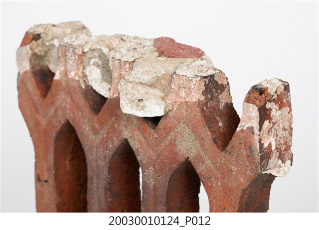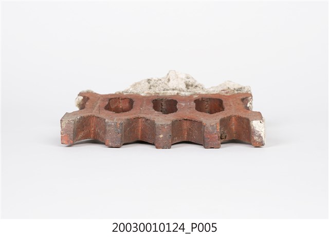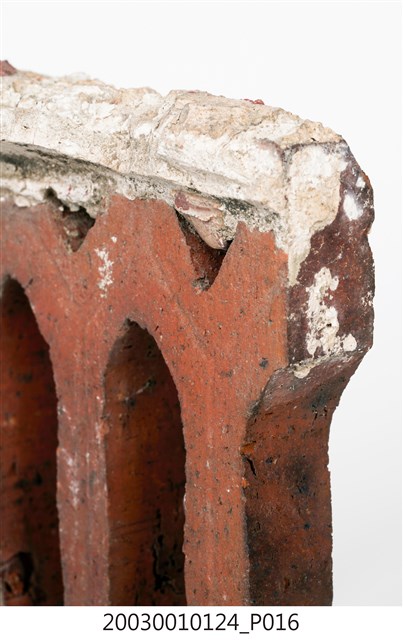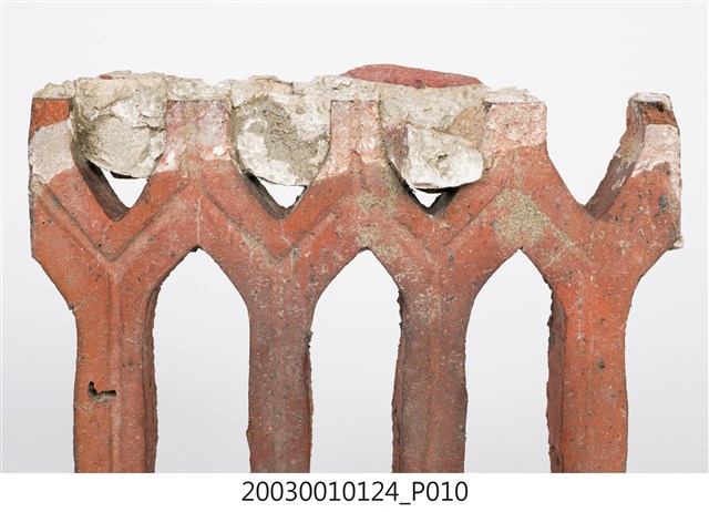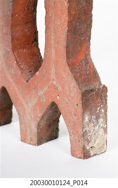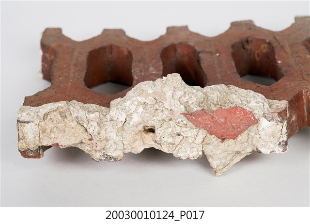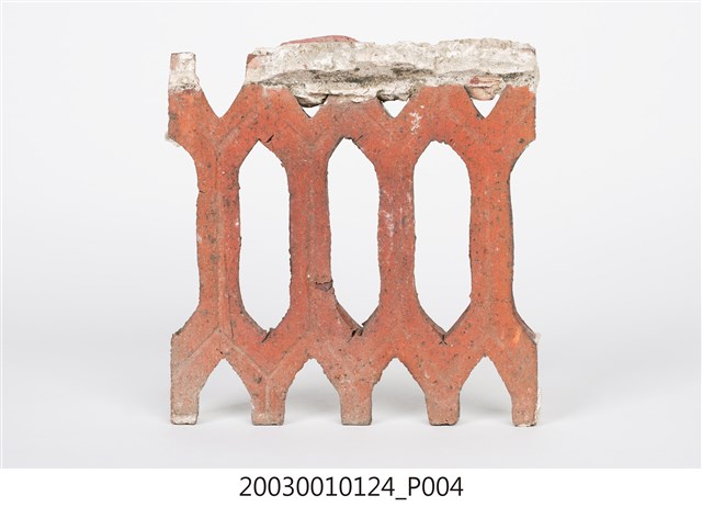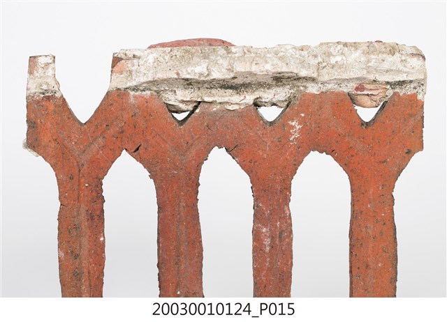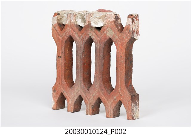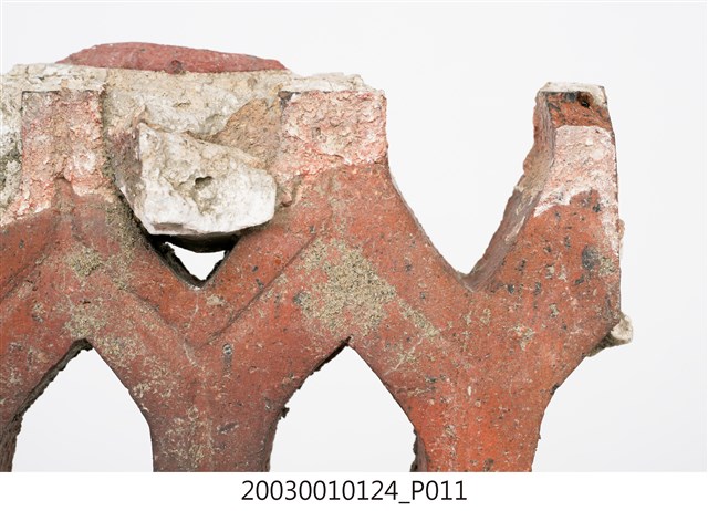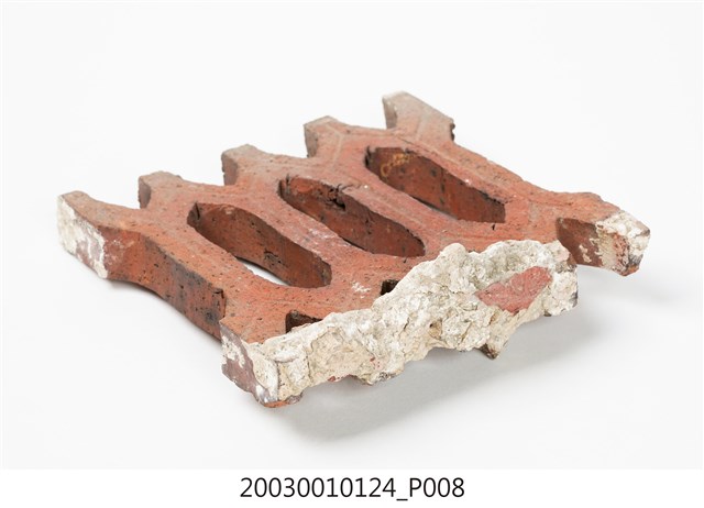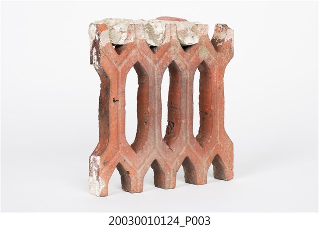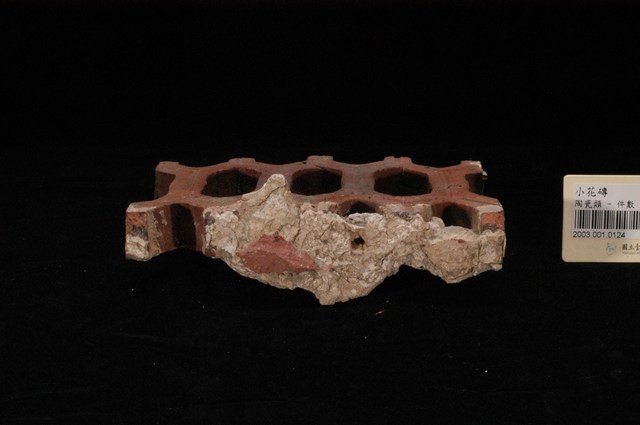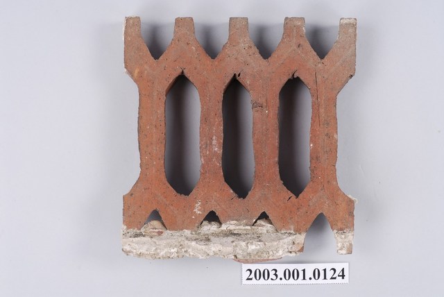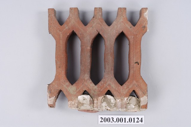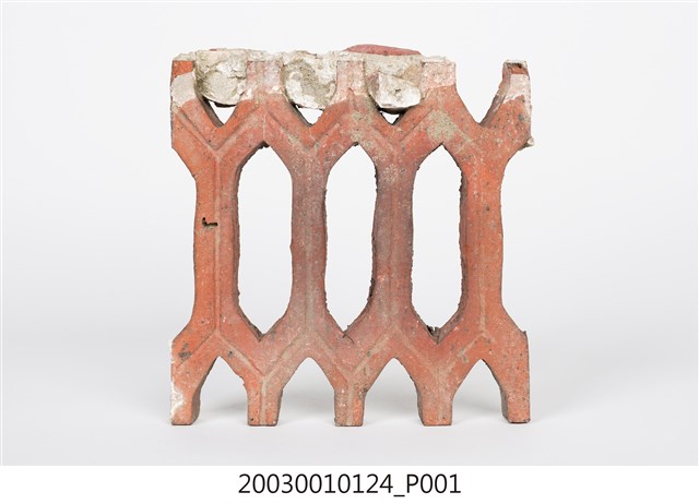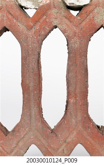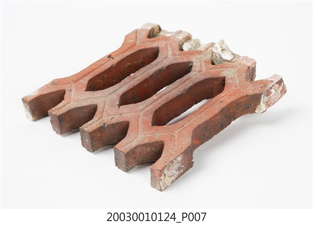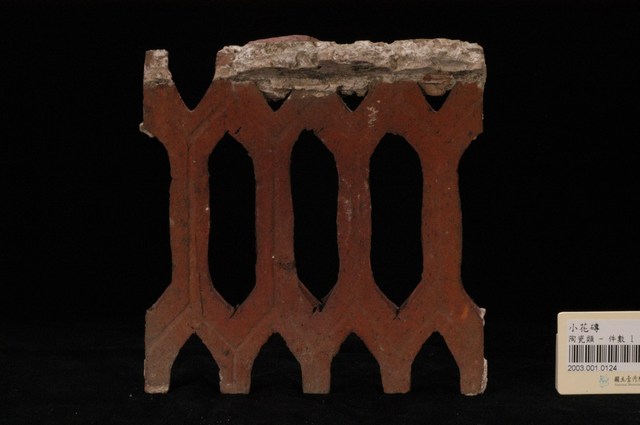 柳條磚取其線條似柳葉形而名之,又稱柳葉磚,是鏤空花磚的一種。為紅色素燒磚。最常見的是以中間三個相連的完整中空長六角形,兩側為半個長六角形組成,通常長寬各約15公分,本件尺寸亦同。本件柳條磚中間為三個長六角形,正反面皆有陰刻六角形線條。柳條磚用於漢式傳統廟宇或民居的氣窗或屋脊,可減輕屋脊重量或增加屋內的通風採光,通常以多塊並列,形成連續龜甲圖案。本件磚邊緣白色灰泥為與建築黏附痕跡。