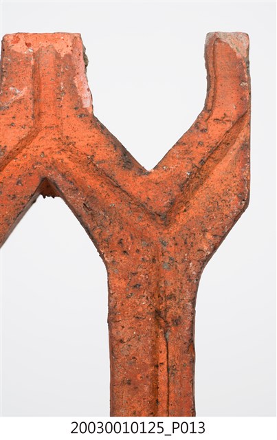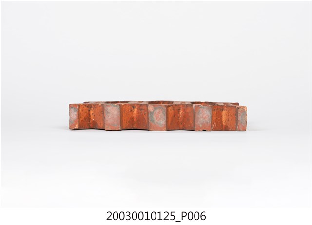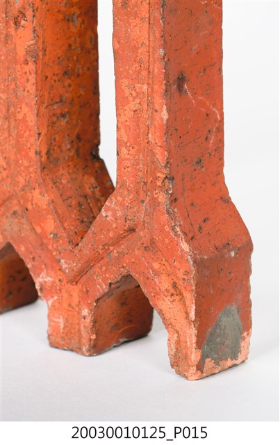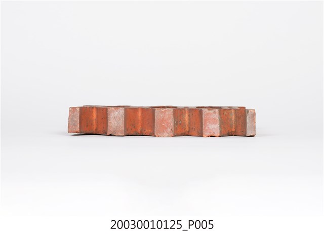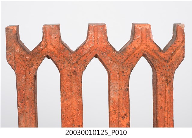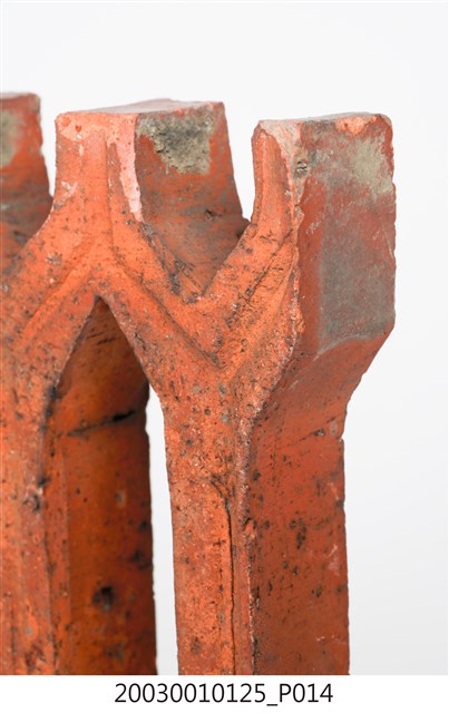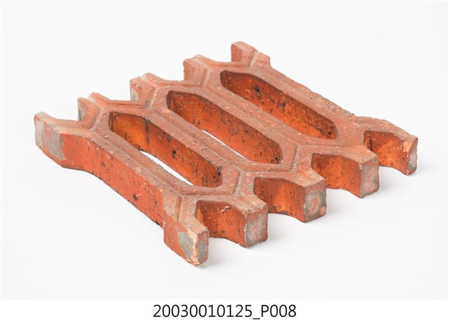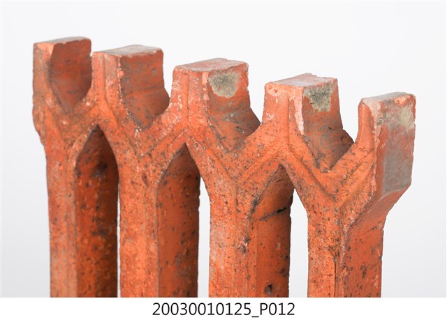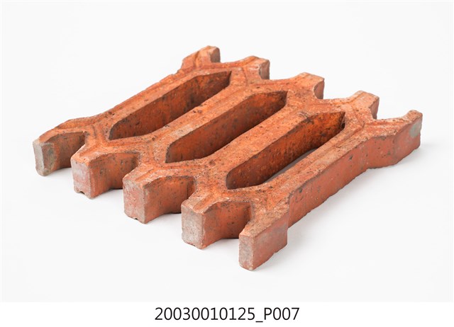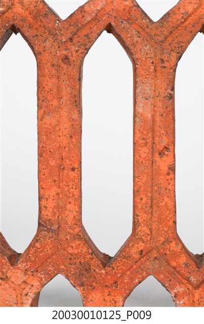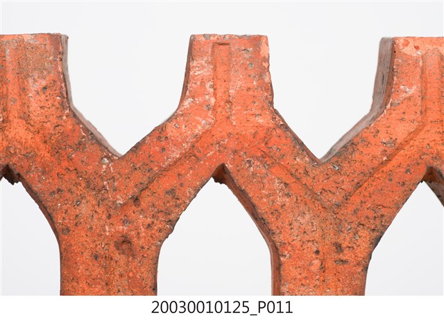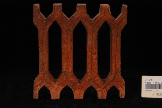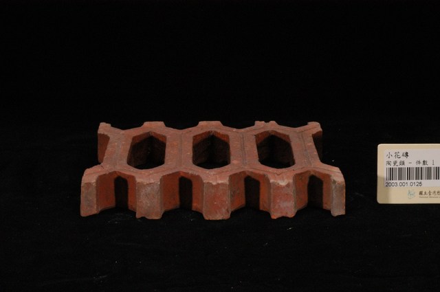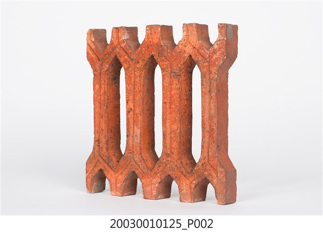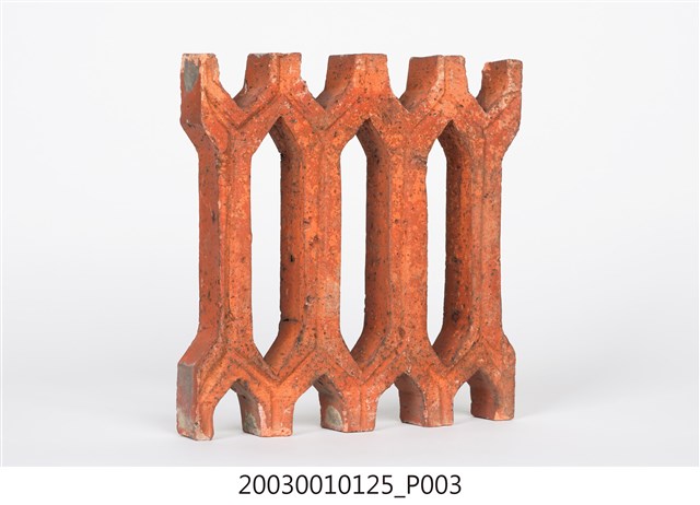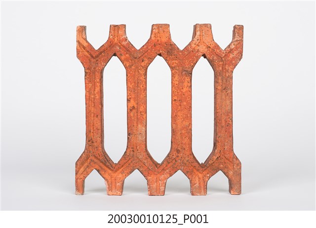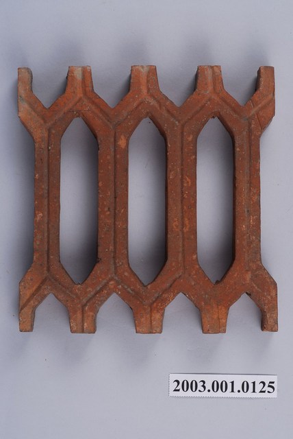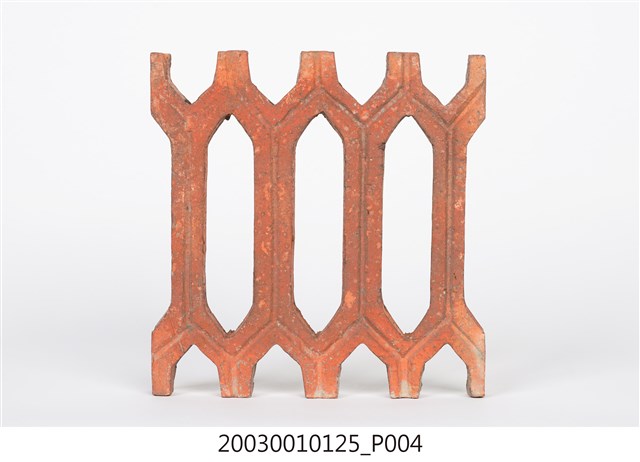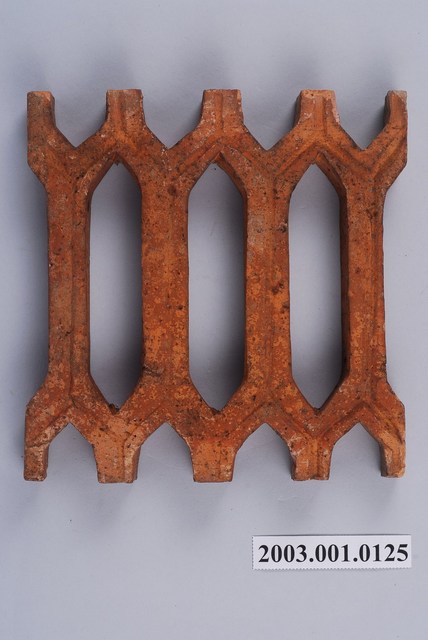柳條磚取其線條似柳葉形而名之,又稱柳葉磚,是鏤空花磚的一種。為紅色素燒磚。最常見的是以中間三個相連的完整中空長六角形,兩側為半個長六角形組成,通常長寬各約15公分,本件尺寸亦同。本件柳條磚中間為三個長六角形,正反面皆有陰刻六角形線條。柳條磚用於漢式傳統廟宇或民居的氣窗或屋脊,可減輕屋脊重量或增加屋內的通風採光,通常以多塊並列,形成連續龜甲圖案。本件磚邊緣白色灰泥為與建築黏附痕跡。