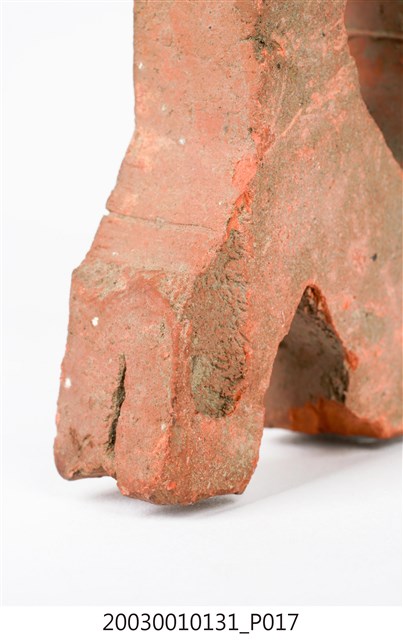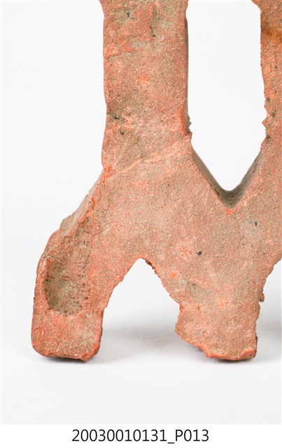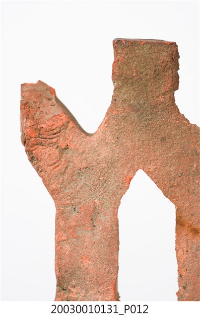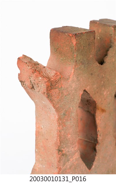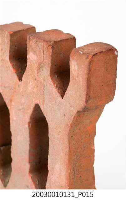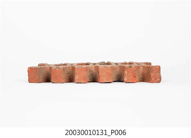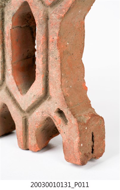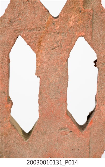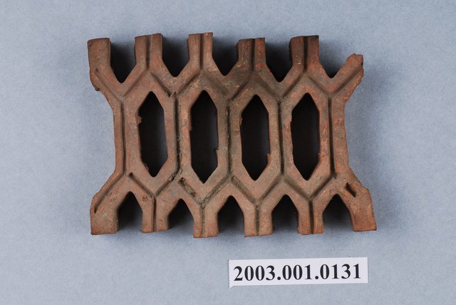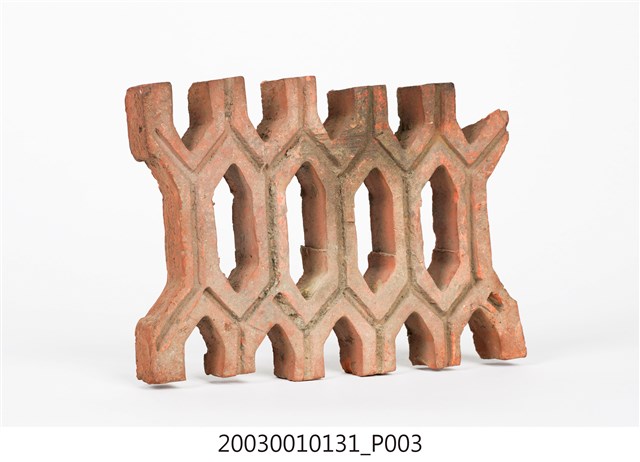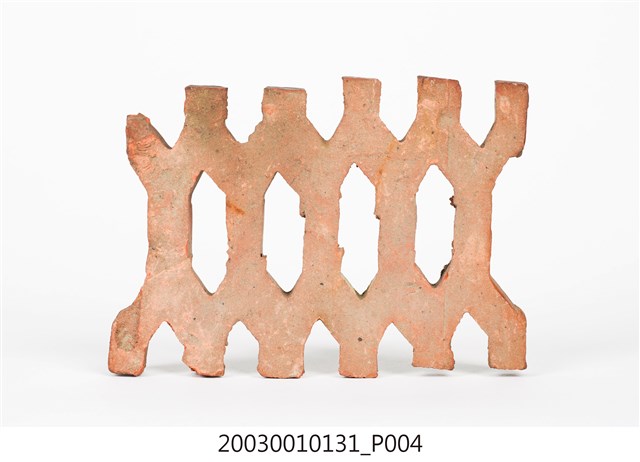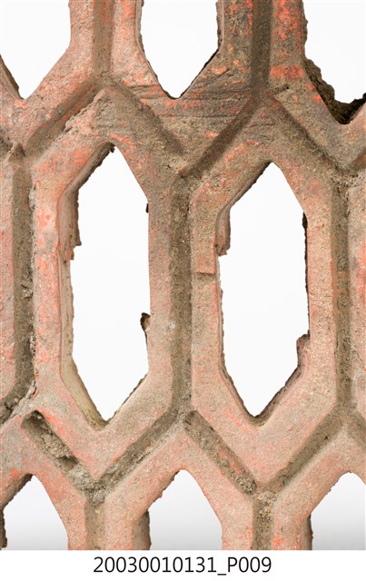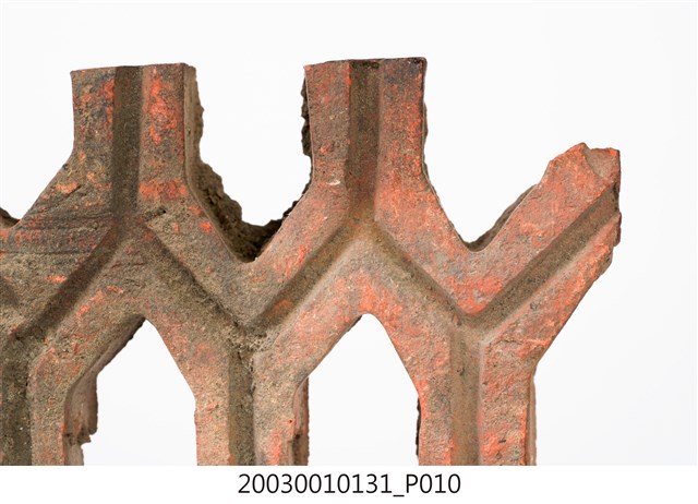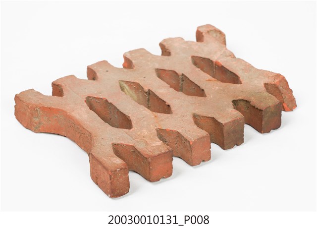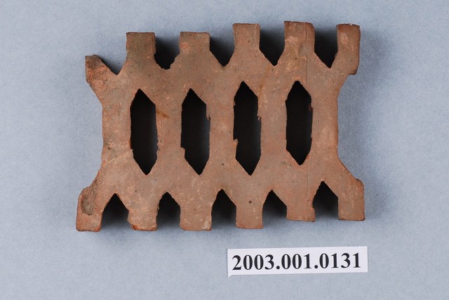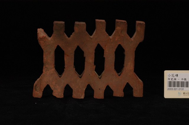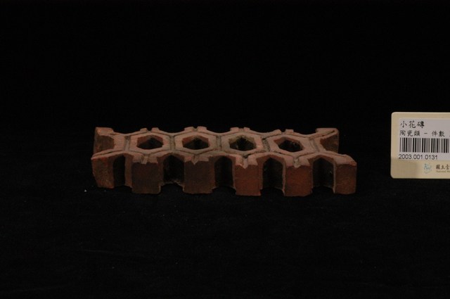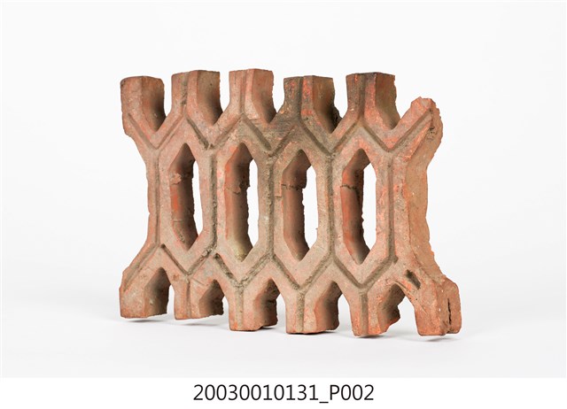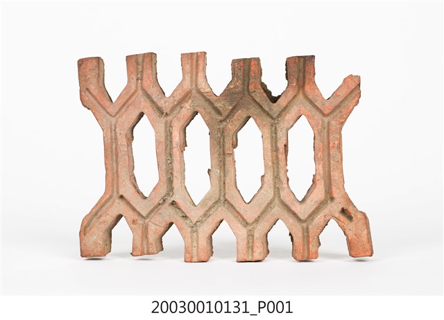 柳條磚取其線條似柳葉形而名之,又稱柳葉磚,是鏤空花磚的一種。為紅色素燒磚。最常見的是以中間三個相連的完整中空長六角形,兩側為半個長六角形組成,通常長寬各約15公分,本件為特殊尺寸,高度僅10公分。本件柳條磚中間為四個長六角形,正面有陰刻六角形線條。柳條磚用於漢式傳統廟宇或民居的氣窗或屋脊,可減輕屋脊重量或增加屋內的通風採光,通常以多塊並列,形成連續龜甲圖案。本件磚局部破損不存。