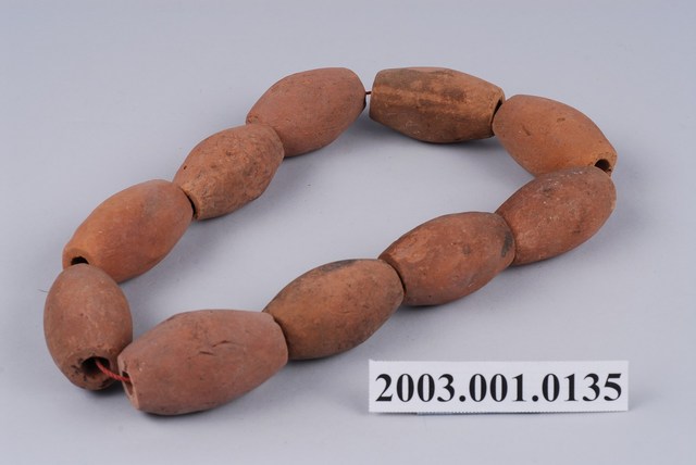 1.此物件為陶製網硾,為一細繩以及10顆沉子串連組合而成的漁具,沉子為陶製品,沉子為中空橢圓狀,部分沉子表面有若干坑洞。 2.網墜是繫於漁具下方使得漁具能下沉於水面之下的一種漁具,為了能沉於水下通常採用密度較高的物質製成,如石材、陶瓷、金屬等。