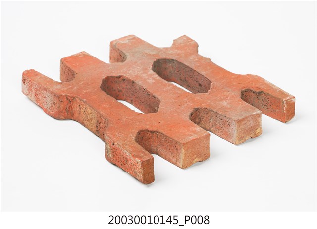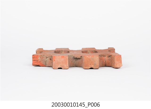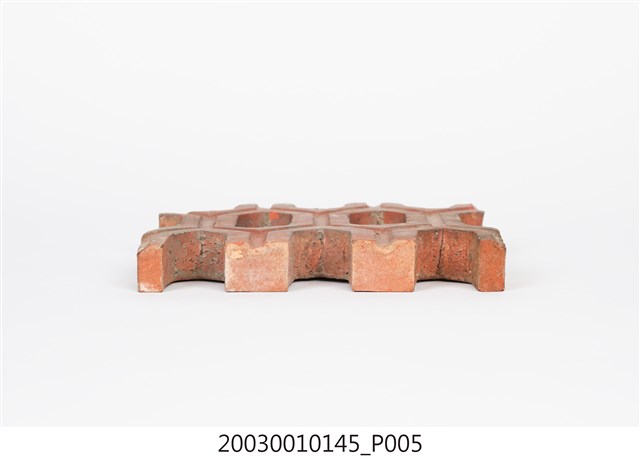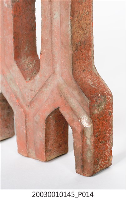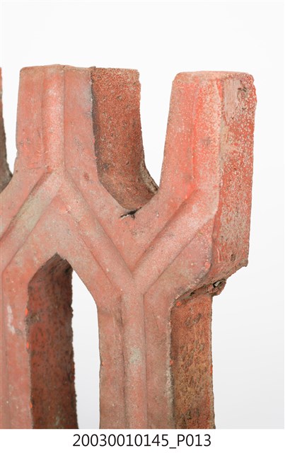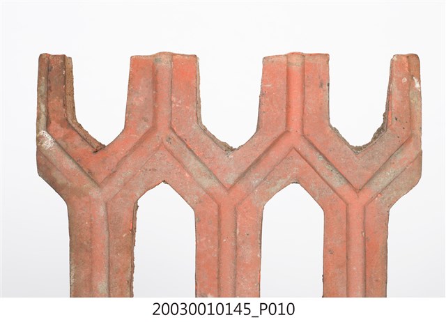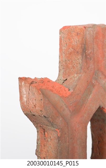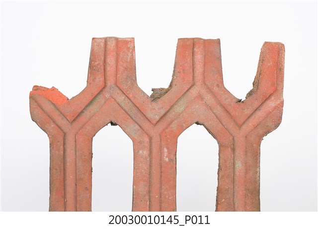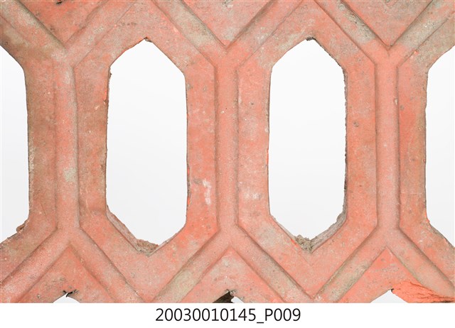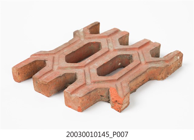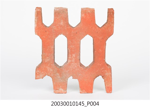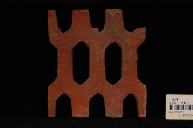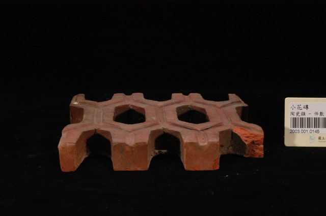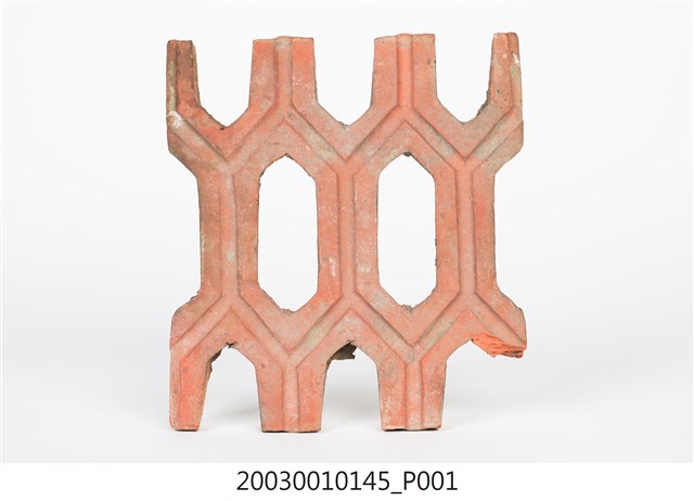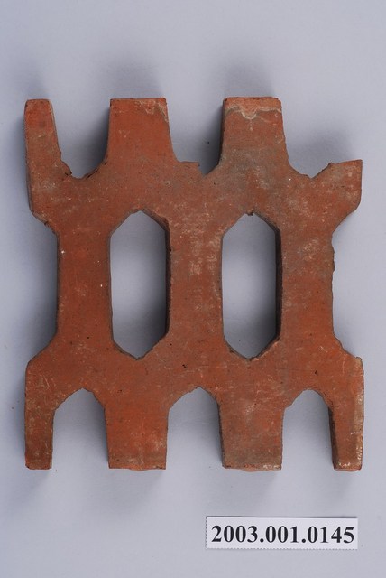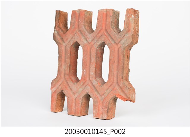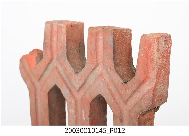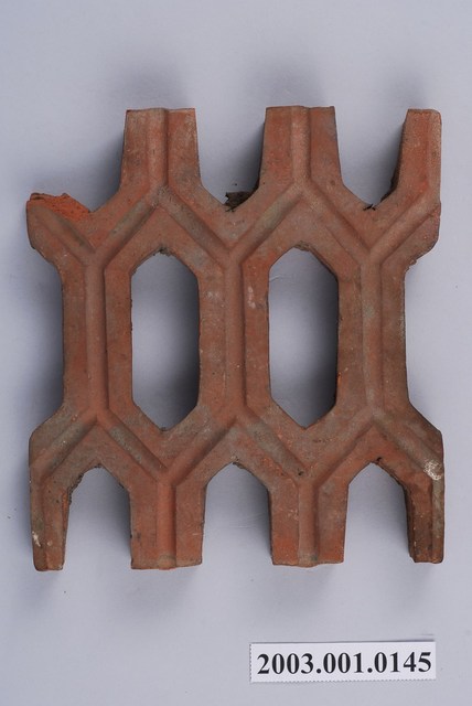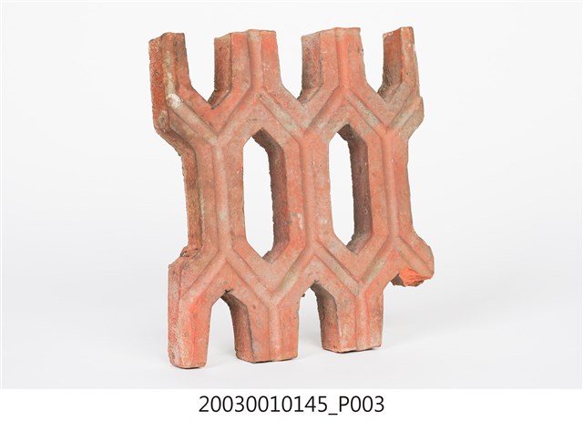 柳條磚取其線條似柳葉形而名之,又稱柳葉磚,是鏤空花磚的一種。為紅色素燒磚。最常見的是以中間三個相連的完整中空長六角形,兩側為半個長六角形組成,通常長寬各約15公分,本件長為15公分,中間為兩個六角形組成,但寬度為13.8公分,僅較通常尺寸少約1公分,因此六角形尺寸較通常作法寬。本件柳條磚中間為二個長六角形,正面陰刻六角形線條。柳條磚用於漢式傳統廟宇或民居的氣窗或屋脊,可減輕屋脊重量或增加屋內的通風採光,通常以多塊並列,形成連續龜甲圖案。本件磚邊緣白色灰泥為與建築黏附痕跡,局部破損不存。