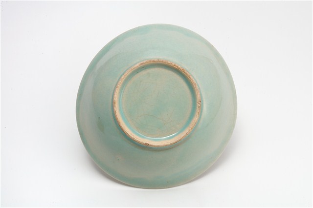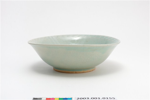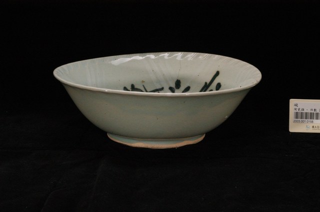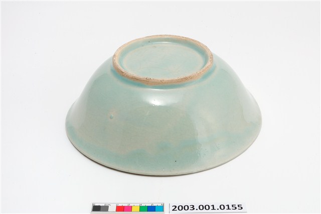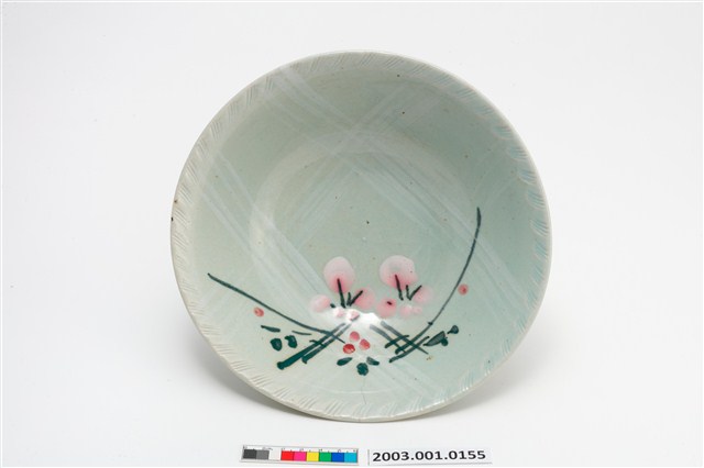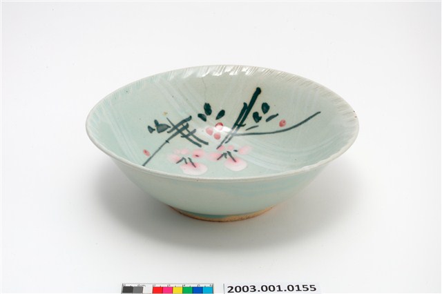 俗稱「大碗公」的常民餐具。侈口、弧壁、帶圈足碗。模製成形,口緣以篦劃紋工具刻連續斜線,做出形似花口的視覺效果。全器除圈足之外滿釉,碗內器壁一側以白、紅、綠、粉紅彩,寫意筆繪折枝花卉紋,再刷毛白泥輕使圓圈紋與交錯的斜直線相映襯,清新可人。外器壁素面無紋,圈足露胎呈灰白色,碗外壁與外足底盈滿的淡青綠釉,猶如一池靜謐的湖水。根據胎釉與裝飾特徵判斷,為北部地區鶯歌等窯製品,其繽紛的色彩引領流行,是戰後初期1960年代廣受歡迎的食器。