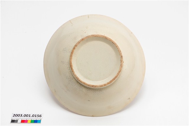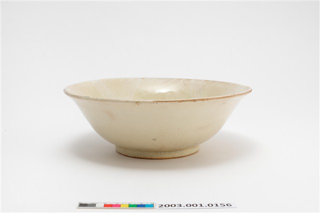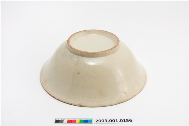 俗稱「大碗公」的常民餐具。侈口、弧壁、帶圈足碗。模製成形,口緣以篦劃紋工具刻連續斜線,做出花口邊,但厚重的淡黃底釉蓋壓篦劃紋,花口邊飾若隱若現。全器除圈足之外滿釉,碗內器壁一側以白、紅、綠彩,寫意筆繪折枝花卉紋與綠籬笆,再刷毛白泥輕使圓圈紋與交錯的斜直線相映襯,清新可人。外器壁素面無紋,圈足裸露黃胎,碗外壁與外足底滿盈淡黃釉。碗內口緣兩道明顯龜裂紋,口緣部分剝釉,碗外器壁近圈足處局部釉面開片,別有歲月的滄桑感。根據胎釉與裝飾特徵判斷,為北部地區鶯歌等窯製品,其繽紛的色彩引領流行,是戰後初期1960年代的陶瓷人氣商品。