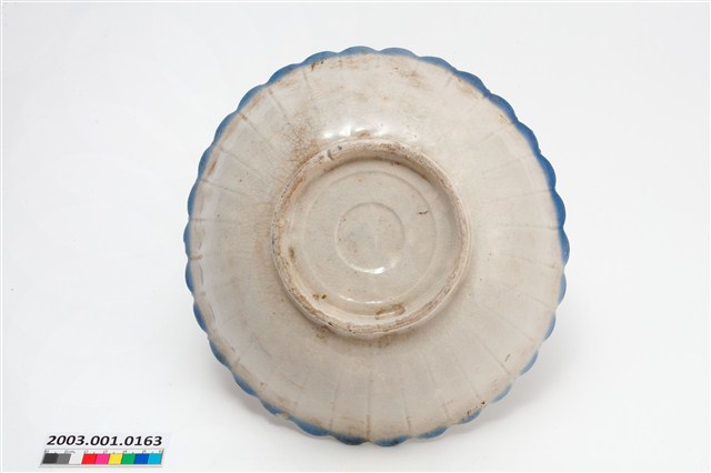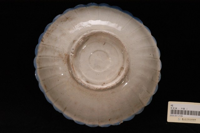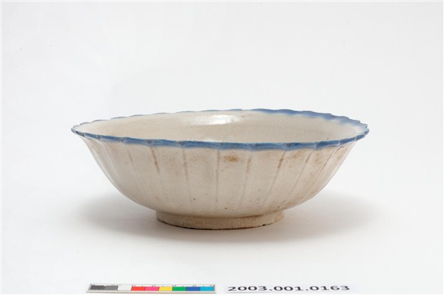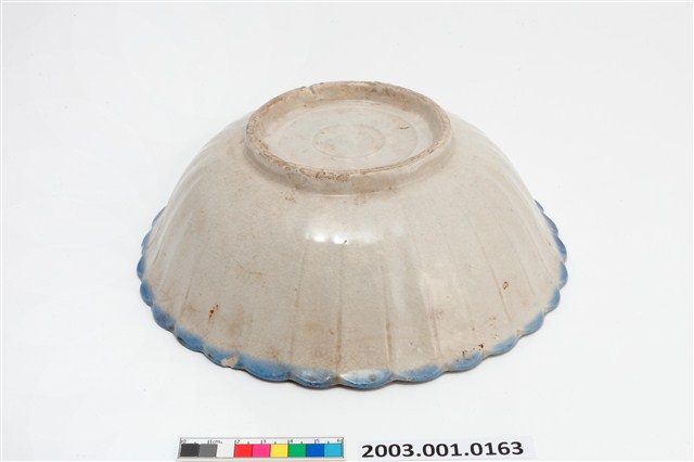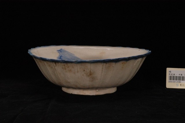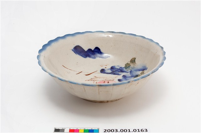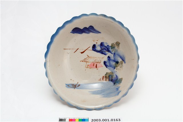戰後初期家庭常見之餐飲用器。敞口、弧壁、碗底較淺而寬,帶圈足大碗,以模具成形,並於白色長石釉上裝飾彩釉之後,高溫燒成。形制上,口緣做成菱瓣形,共三十瓣花口,碗壁亦模印一道一道的花瓣稜脊,整個碗彷彿一朵盛開的花兒。裸足露灰白胎,足內沾黏少量窯沙,圈足之外全器滿釉。碗外壁素面無紋,僅有幾許使用髒污痕跡。花口緣施罩一圈青色釉彩,碗心並用彩繪與印花兩種技法,以青、藍、綠、粉紅、褐彩顏料描寫孤舟、老藤、野屋、飛鳥、遠山風景。孤舟、竹籬、房舍與綠樹採用印花裝飾技法,遠山、近水與樹石則以純熟筆法寫就。整體畫面無論是構圖設計、流暢筆法或色彩配置,皆搭配合宜,賞心悅目。1960年代北部地區鶯歌等窯製品。本件作品與典藏品2003.001.0162彩繪山水紋花口瓷碗風格幾乎一致,很可能是同一批號生產。這也符合家庭餐具經常是成套採買的消費模式。