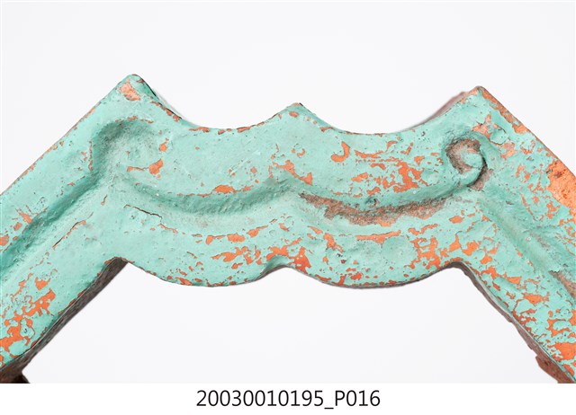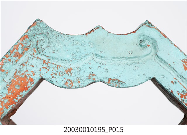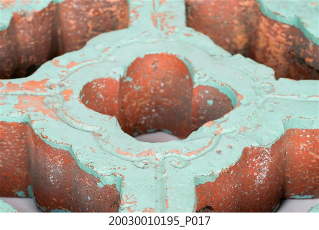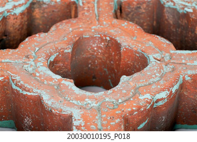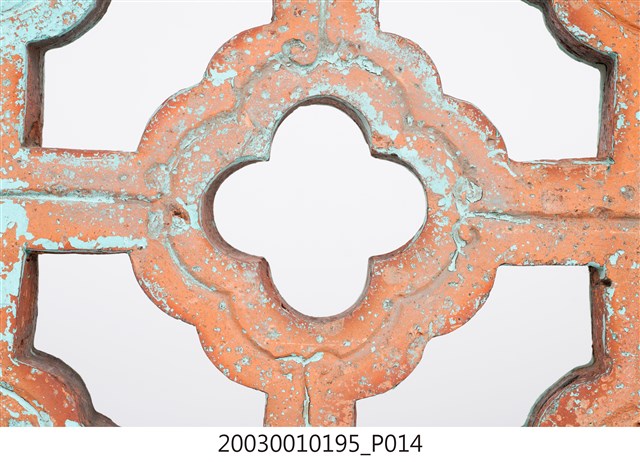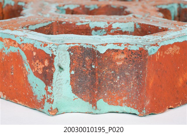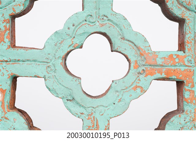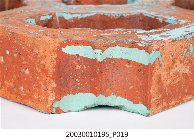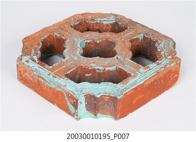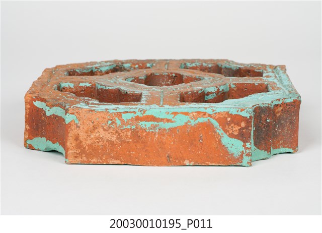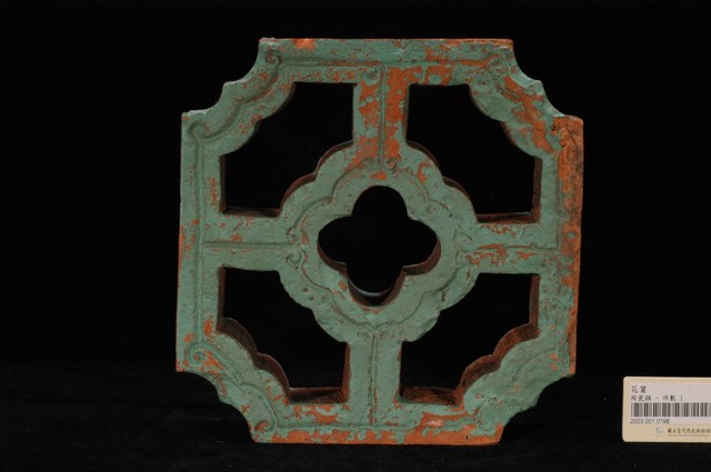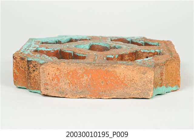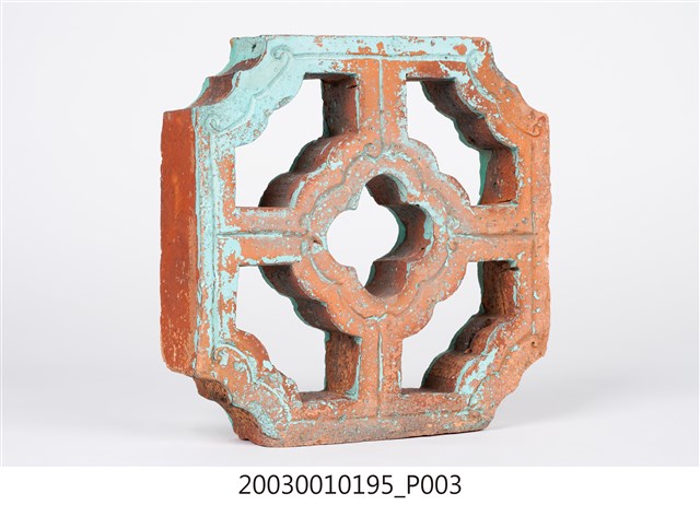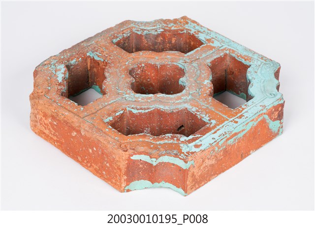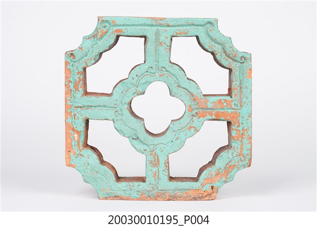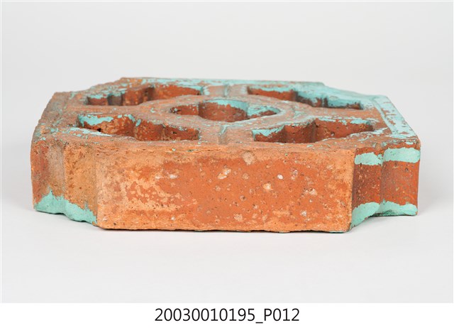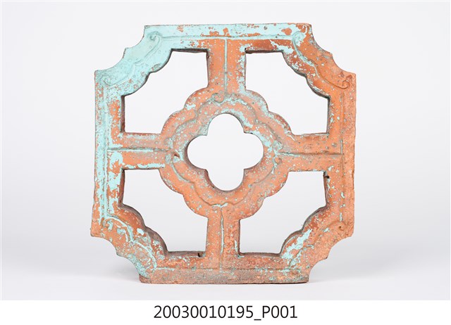 本件文物為素燒花磚,又稱鏤空花磚、素胎花磚、花磚、花窗,鏤空具透氣效果,通常作為漢式傳統廟宇或民居的氣窗使用,因此又稱花窗。也常成排並列,作為圍牆的裝飾。花磚為模具素燒紅磚,自清末至今皆有燒製。本件中央為柿蒂紋,向四邊十字延伸將圖案切割成四塊,四邊切角使花磚呈八角形,兩面皆有陰刻線條。本件文物與館藏號2003.001.0196、2003.001.0197花磚,正背兩面都有綠色油漆,應為裝置在建物上時所加,顯示此三件文物原裝置在同一建物上。