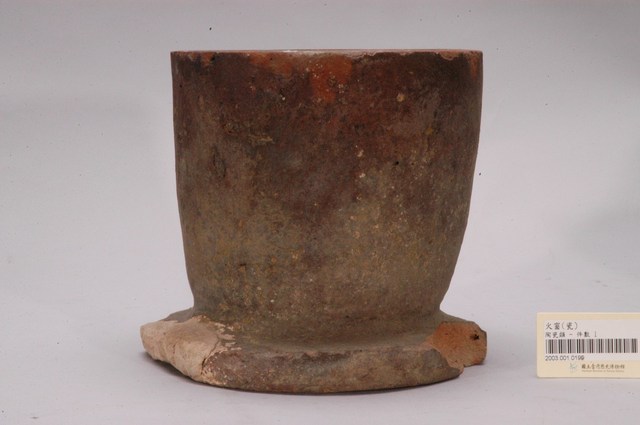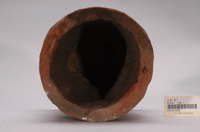 1.素燒陶製火窗,圓桶形,上寬下窄,器底接扁圓形底座,底座邊緣有一塊破損缺口。胎土為紅土,無上釉,表面粗糙有許多坑洞,內器壁中央豐厚,半掩器口。2.火窗為冬天取暖的用品,在臺灣多稱為「火爐」,日本人稱為「火缽」,通常是圓形的陶盆。天冷時,將燒紅的木炭放置其中,烤火取暖。