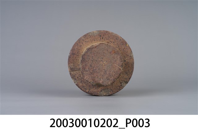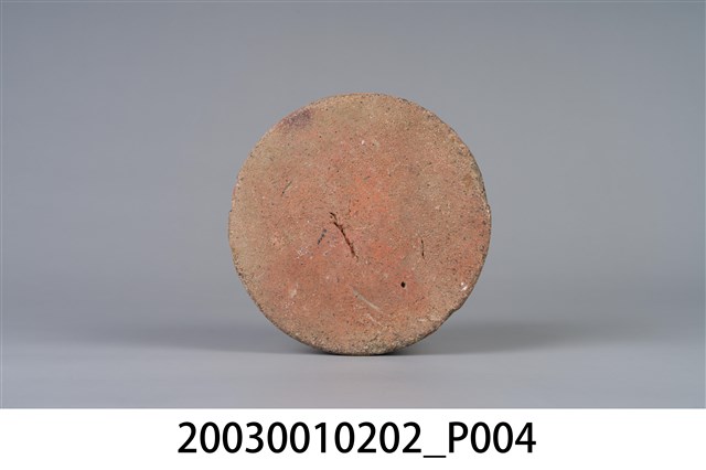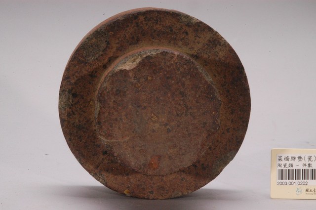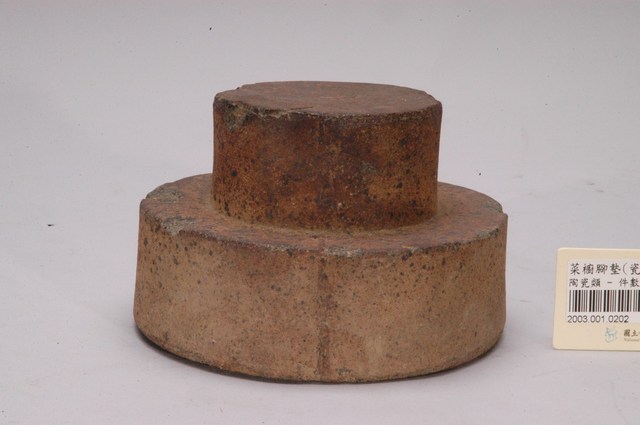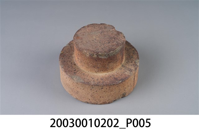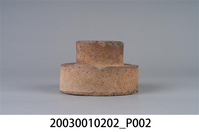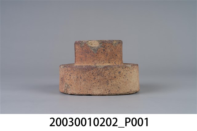 1. 圓柱形桌腳墊,瓷製,長13.1cm、寬13.1.cm、高8.3cm,器表施磚紅色釉,外型為雙層圓柱體,無溝槽,各處皆有磨損或破口,造型簡單實用。2. 這類桌腳墊與具有溝槽的類型不同,具有溝槽的桌腳墊可以注水來隔絕蟲蟻,而這類無溝槽者主要是用來墊高餐桌、菜櫥以阻隔濕氣,保護木製家具。