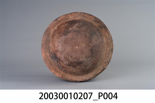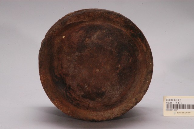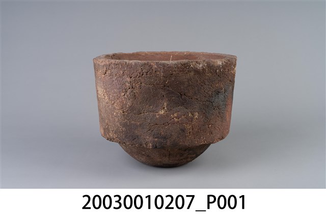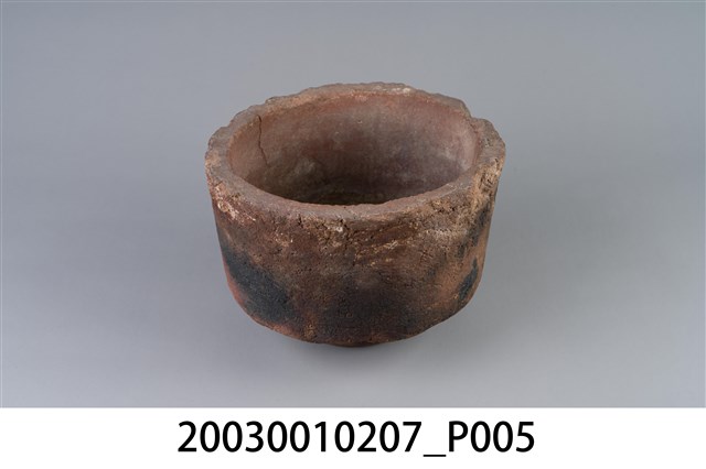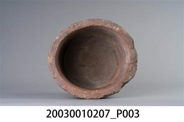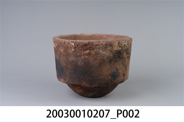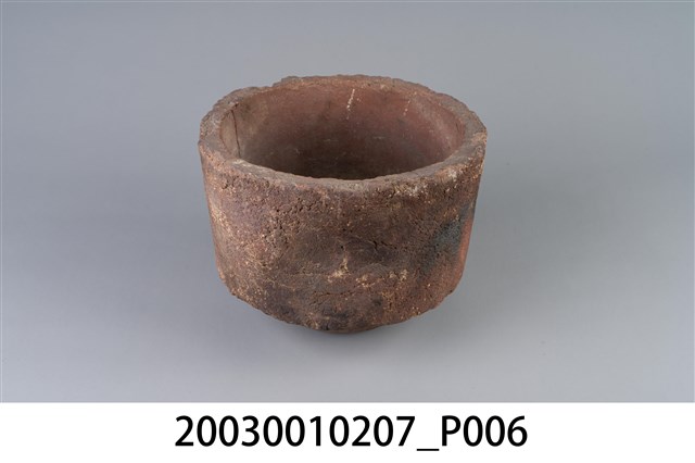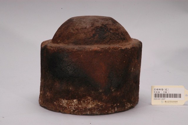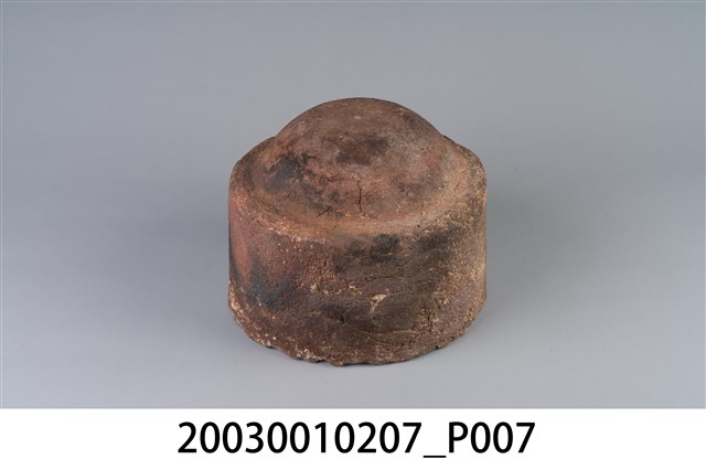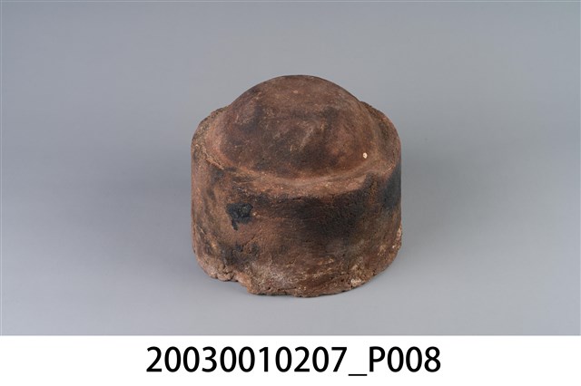 1. 瓷製圓柱覆碗形桌腳墊,器身為圓柱形,上端做覆碗狀,頂端為平面,用以承接桌櫥之腿足。通體施深磚紅色釉,釉色不均,並有黑色燒灼痕跡。器形不規整,器身略有歪斜,整體而言裝飾簡約、做工樸拙。2. 又稱櫥仔腳的桌腳墊,依其功能主要可以分為兩種類型,第一類是器中具有溝槽的形式,溝槽承水可以有效阻隔蟲蟻,使之無法爬上餐桌、菜櫥。本件則屬於沒有溝槽的類型,,不具防蟻作用,其功能是單純墊高木製桌櫥,使之不受到地面濕氣之影響,延長木料壽命。