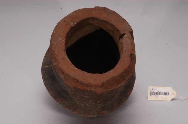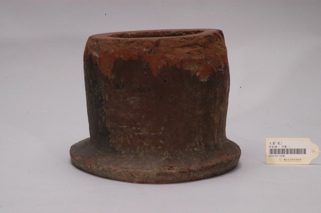 1.素燒陶製火窗,圓桶形,器口一側偏高,器底接扁圓形底座,底座邊緣有一破損。胎土為紅土,無上釉,表面粗糙有許多坑洞,器身和底座為褐紅色,器口則偏磚紅色。2.火窗為冬天取暖的用品,在臺灣多稱為「火爐」,日本人稱為「火缽」,通常是圓形的陶盆。天冷時,將燒紅的木炭放置其中,烤火取暖。