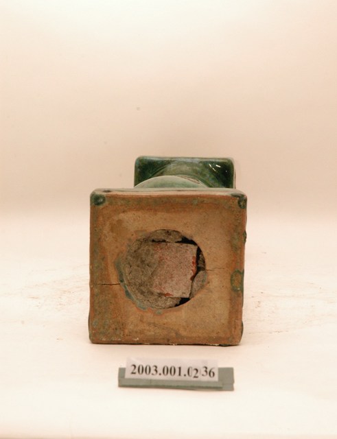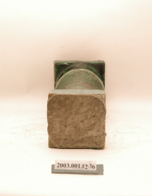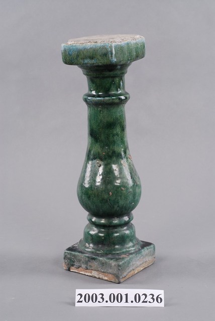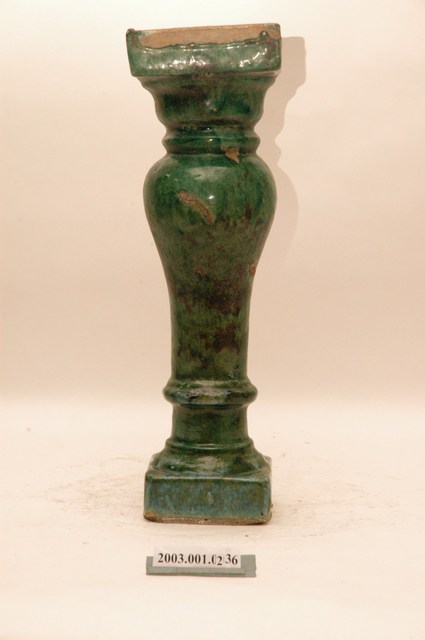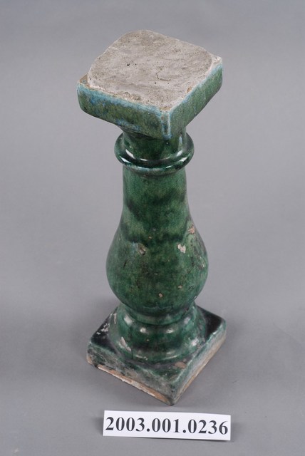 本件文物為綠釉花瓶欄杆。為模具陶燒製品,表面上綠釉,採低溫燒製。綠釉花瓶欄杆通常用於街屋牌樓面的二樓陽臺,或頂部牌樓,仍與紅磚搭配。本件欄杆上下有黏附灰泥痕跡,內填塞磚片以利灰泥黏附,顯示曾用於建築上。