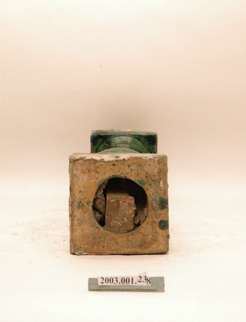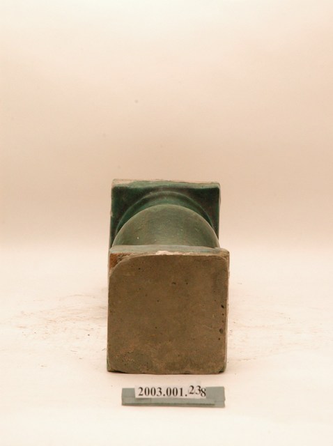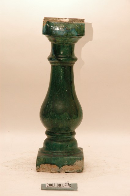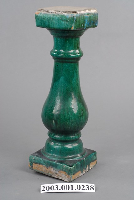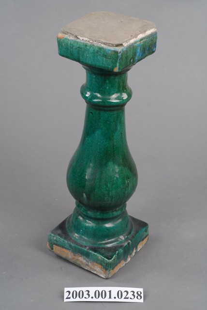 本件文物為綠釉花瓶欄杆。為模具陶燒製品,表面上綠釉,採低溫燒製。綠釉花瓶欄杆通常用於街屋牌樓面的二樓陽臺,或頂部牌樓,仍與紅磚搭配。本件欄杆上下有黏附灰泥痕跡,內填塞磚片以利灰泥黏附,顯示曾用於建築上。