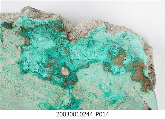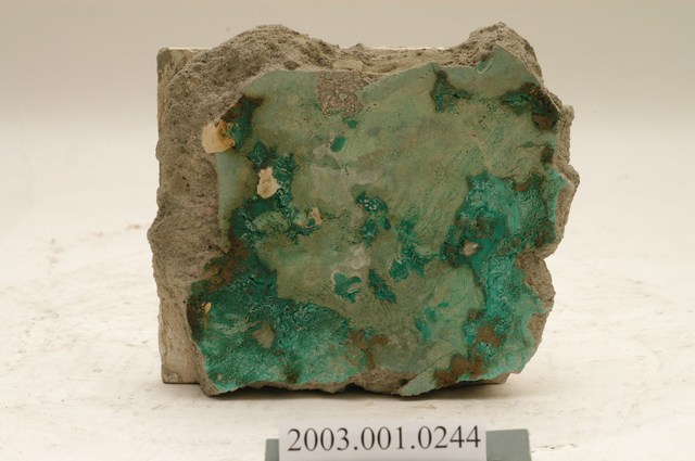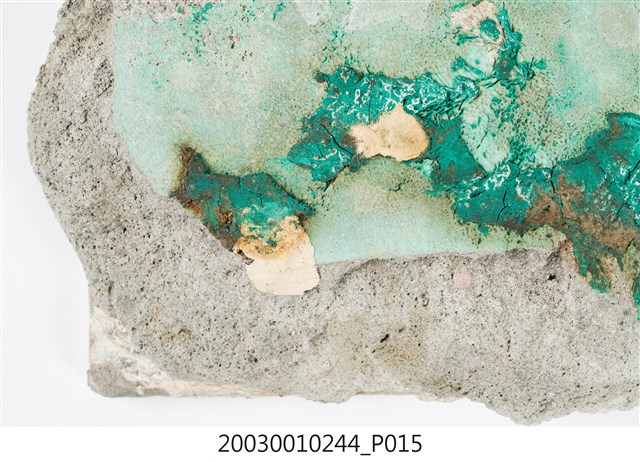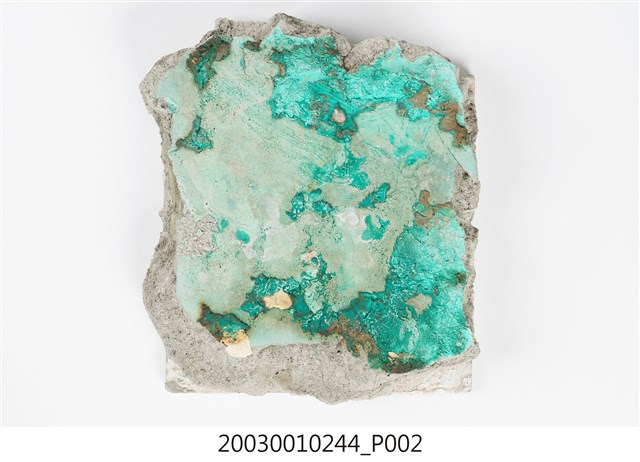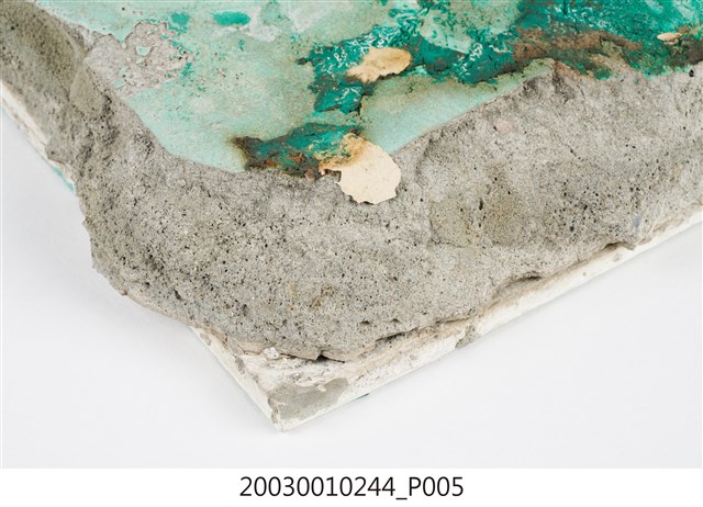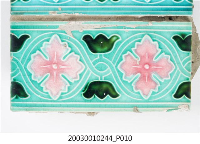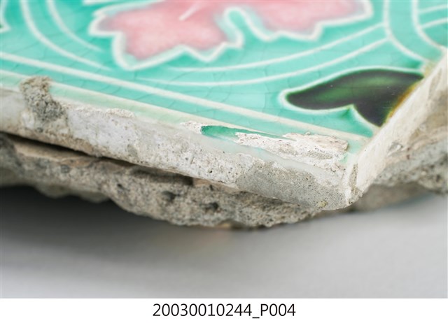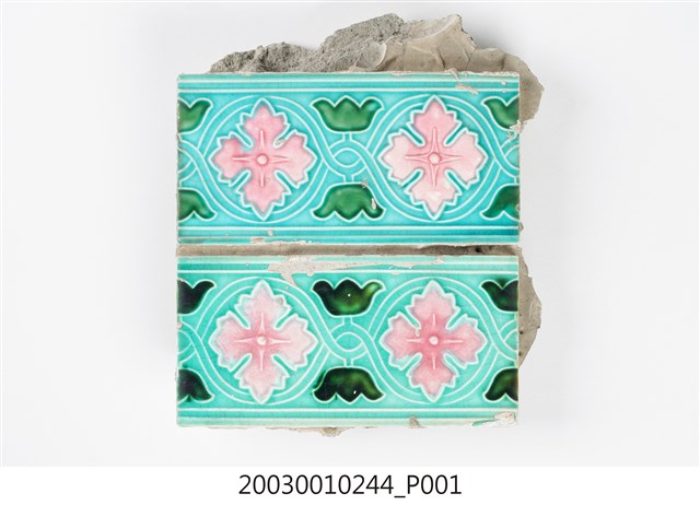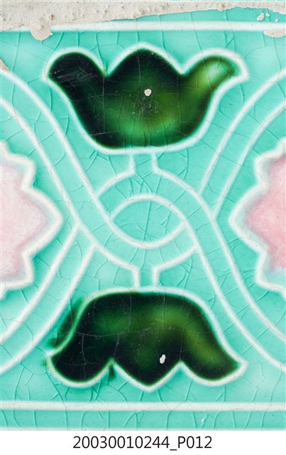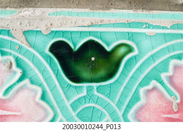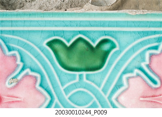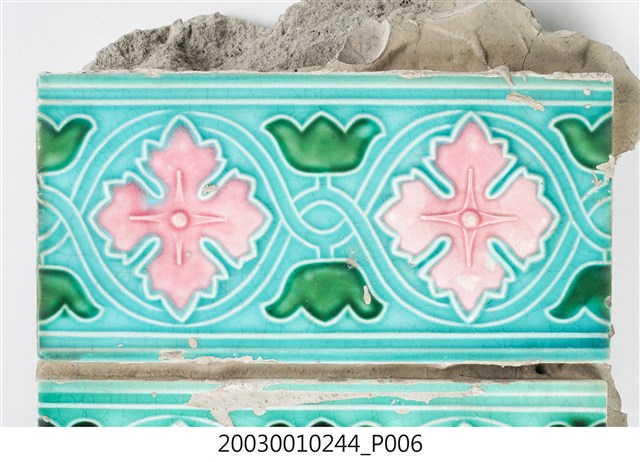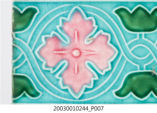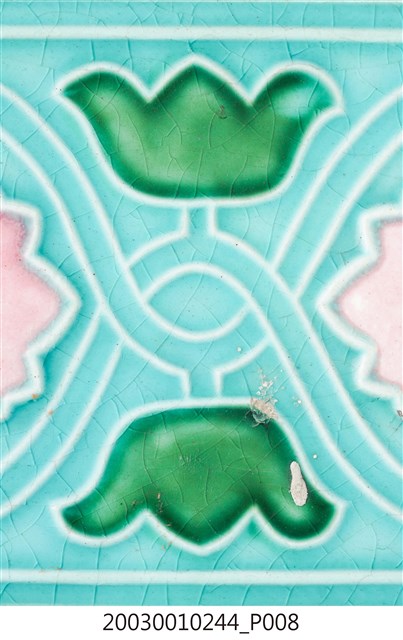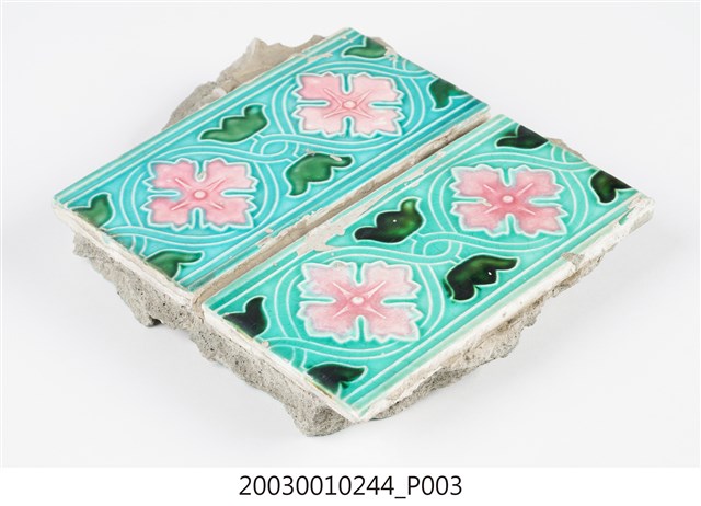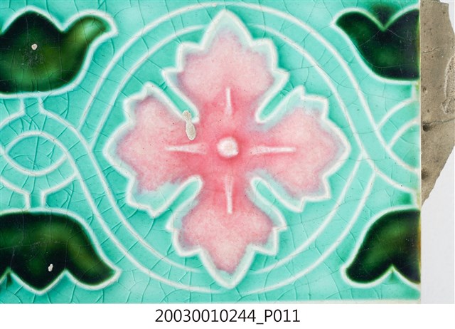 本件包括兩片相同圖案的馬約利卡磁磚,黏附在同一塊水泥上。臺灣稱馬約利卡磁磚(Majolica Tile)為彩磁,是一種彩繪錫釉磁磚,使用乾黏土,以機器壓胚,人工上釉彩後燒製而成,上彩的方式有手繪、浮雕、轉印、Tube Lining等技法,本件為Tube Lining技法。臺灣引入的馬約利卡磁磚尺寸大多為6吋x6吋,亦有6吋x3吋、3吋x3吋等,本件為6x3吋。本件磁磚底色為藍綠色,以白色弧線連接主體花葉,主體圖案為四瓣花與元寶葉,元寶(財)形屬中國吉祥紋樣,四瓣花則為西方圖案,本件為中西合併,較有可能為日本創作圖案。