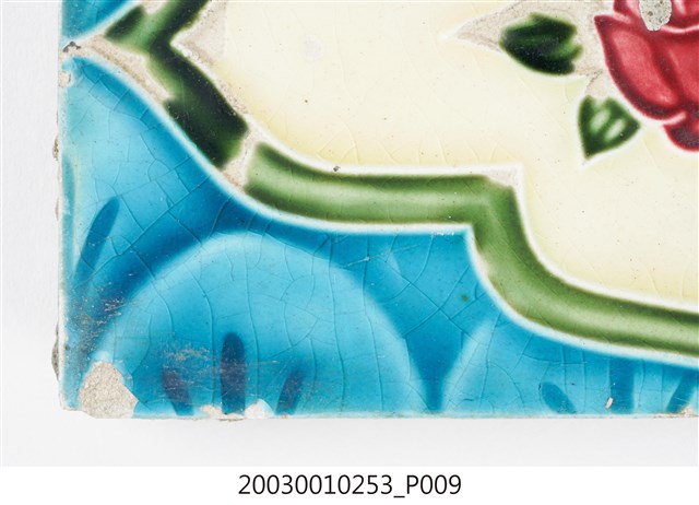 馬約利卡磁磚(Majolica Tile),臺灣稱為彩磁,是一種彩繪錫釉磁磚,使用乾黏土,以機器壓胚,人工上釉彩後燒製而成,上彩的方式有手繪、浮雕、轉印、Tube Lining等技法,本件為Tube Lining技法。臺灣引入的馬約利卡磁磚尺寸大多為6吋x6吋,亦有6吋x3吋、3吋x3吋等,本件為6x3吋。本件磁磚底紋以藍色抽象樹形圖案層層排列而成,中間底色為白色,邊框為綠色四瓣花圖案,核心是兩朵玫瑰,玫瑰是英國維多利亞磁磚最常用的題材。本件磁磚圖案為英國維多利亞磁磚的變體,英國原圖案為6x6吋的方形構圖,日本仿製時將圖案壓扁成6x3吋。本件磁磚邊緣釉色有少許剝落,背面黏附水泥,與館藏號2001.001.0268、2003.001.0251-0252等三件為相同產品。
