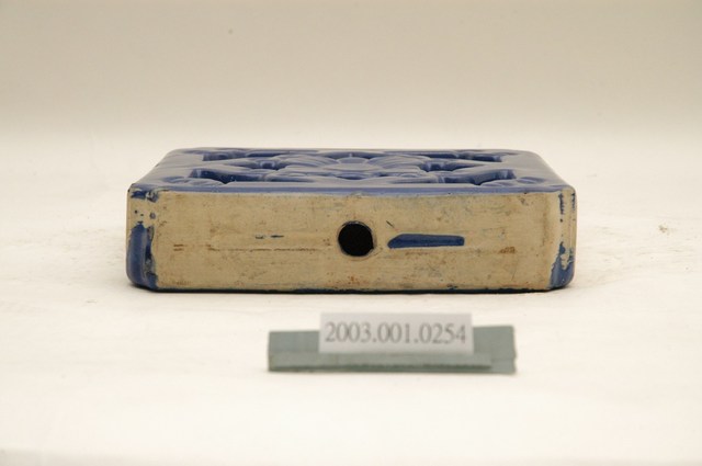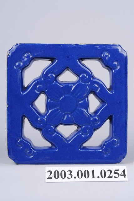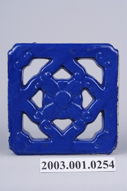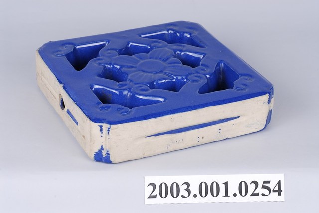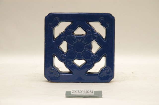 本件文物為琉璃花磚,一般又稱綠釉花磚,此件為藍釉,與一般上綠釉不同。臺灣的綠釉花磚清代由閩粵引進,日本時代臺灣開始少量燒製。戰後臺灣開始大量燒製,圖案及作法皆相同。花磚表面上綠釉,採低溫燒製。長寬約一尺,通常位於壁體高處,作為透氣窗使用,作為窗使用時稱為花窗。常見位置在傳統閩南漢式建築山牆下鵝墜位置,以三個一組組合成磬牌圖案,及正立面氣窗,以及日本時代的牌樓厝女兒牆等。通常與紅磚牆搭配。