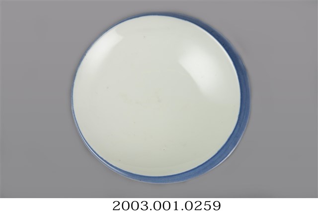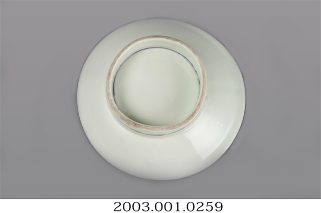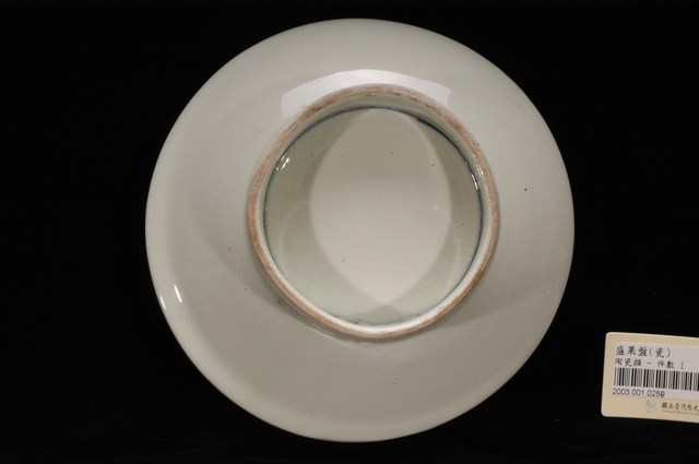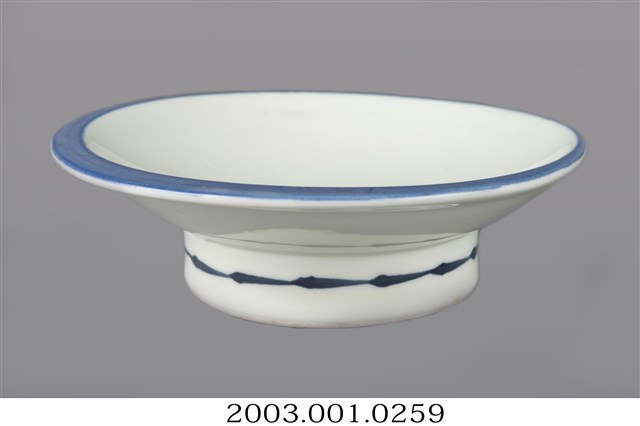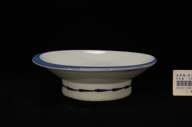 圓形高足果盤。瓷質,轆轤拉坯法製作。器壁向上斜出,深器腹,侈口,折沿,直立高圈足。全器潔白細緻,器口飾以一圈青花線條,器足飾以一環連續的青色長菱形紋,器面顯得十分簡潔。無款識,產地不詳,應是日本製品。