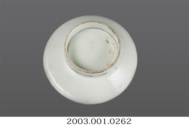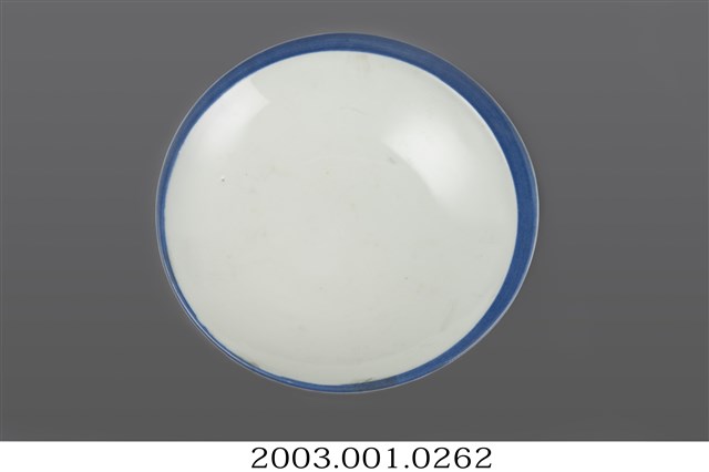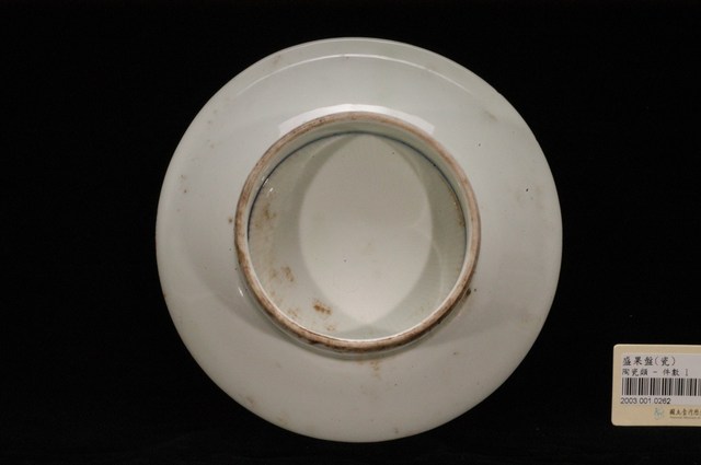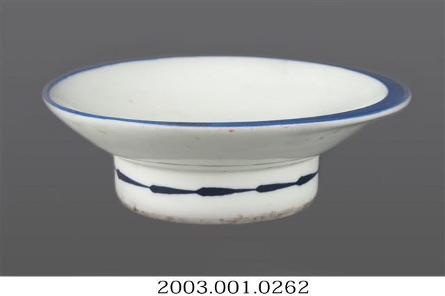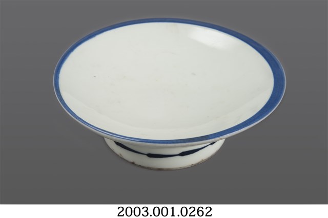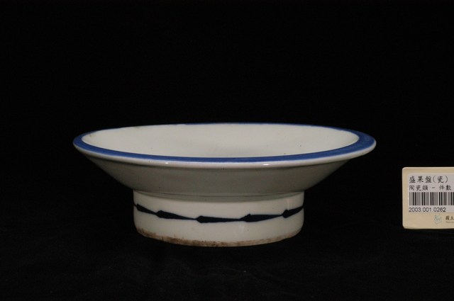 圓形高足果盤。瓷質,轆轤拉坯法製作。器壁向上斜出,深器腹,侈口,折沿,直立高圈足。全器潔白細緻,器口飾以一圈青花線條,器足飾以一環青色連續的長菱形紋,器面簡潔,無款識,產地不明。