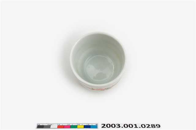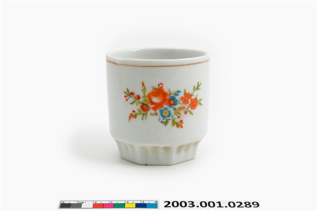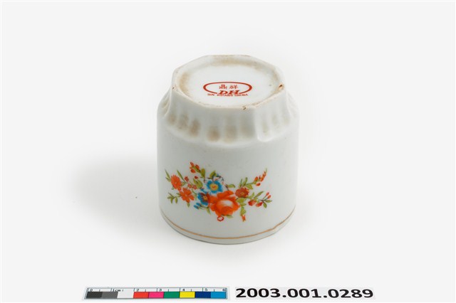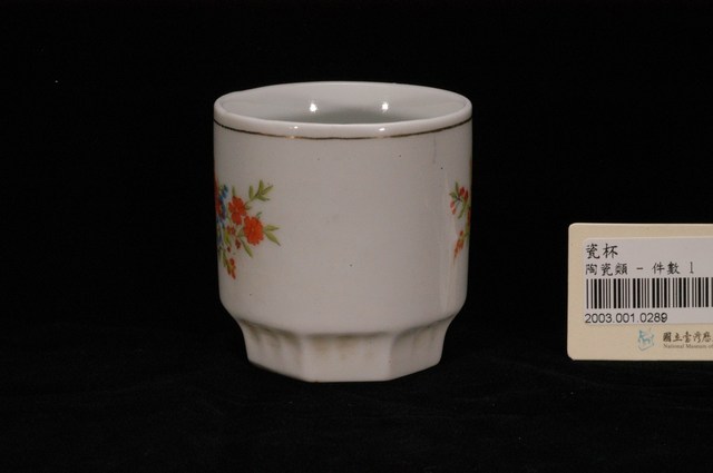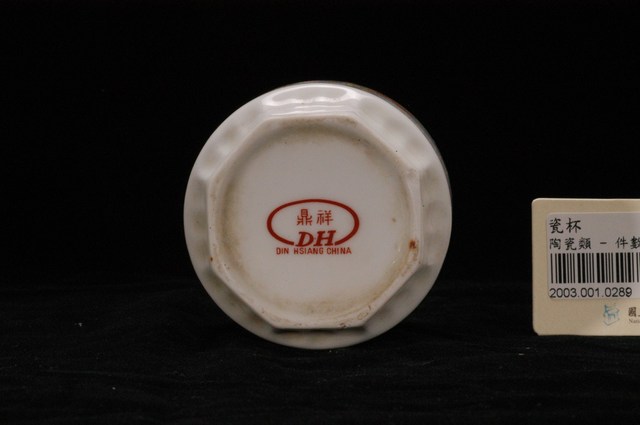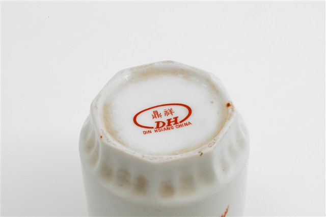 當代臺灣陶瓷窯業茶杯製品,杯底落款「鼎祥 DH DIN HSIANG CHINA」。模製精磁,磁化程度高,坯土純白細膩,透明釉光亮。外形直壁直口,矮圈足,屬於日治後期以降最常見的高杯器型。杯口飾描金線圈紋,杯腹施以銅版轉印花卉紋,紋樣細緻。屬量產商品。