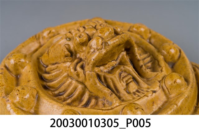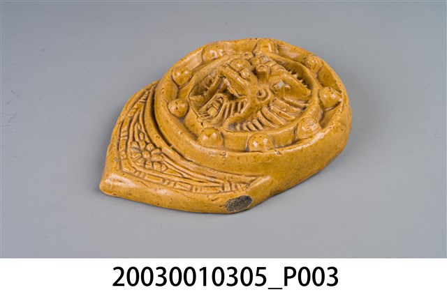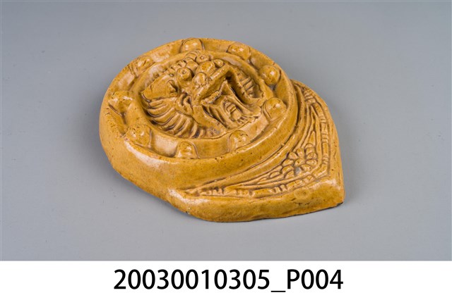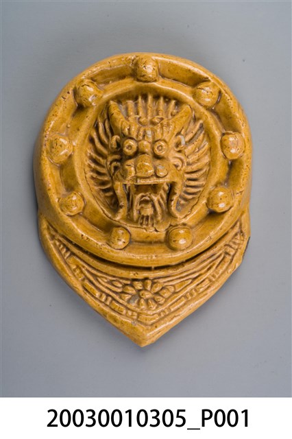 本文物琉璃瓦當,為外覆黃釉的瓦當,又稱筒瓦頭。傳統的瓦當是圓形瓦與筒瓦結合而成的構件,運用於筒瓦屋頂的最底部,作用為封住鋪設到屋簷端的筒瓦底部。本件造形改變,不作筒瓦身,圓瓦背面中央突起以增加黏合度,此為應現代水泥建築形態所作改變。正面圓形瓦下部增加滴水三角造型,將傳統圓形瓦當與三角滴水合為一體。臺灣傳統瓦當多以吉祥文字或蓮花紋為圖案。本件瓦當上為龍頭紋,下為花朵紋,為戰後新設計的圖案。本件瓦當背面有灰泥黏附,顯示曾用於建築上。