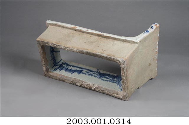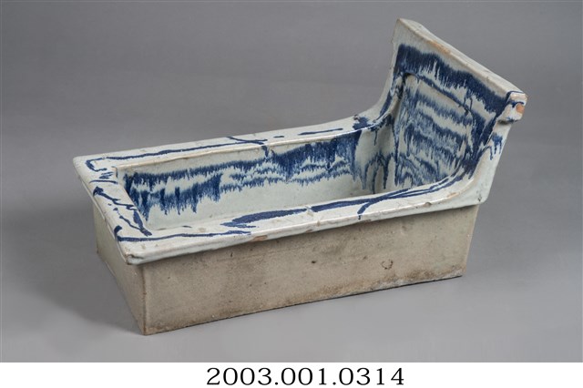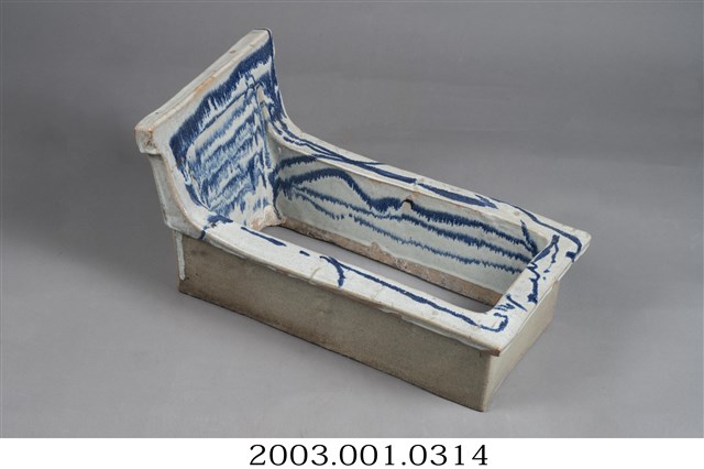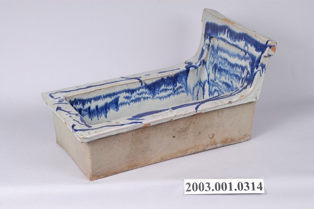1.此為青花瓷馬桶,器長50.9公分,寬29.1公分,高27.4公分,器形長方狀,中間底部簍空,瓷土燒製。短側邊有方形山牆,肩部內凹。器腹四方向外折沿,底為白色瓷坯,繪以藍色鈷水波紋及簡單線條裝飾。器身內側四立面及口緣皆有上釉,外側立面無上釉,口緣接縫處多有上釉不均之情形,有部分掉漆斑駁。2.青花瓷馬桶初期多來自日本,後期才出現臺灣工廠生產的款式,使用時將馬桶裝設在已挖好的糞管(坑)之上,器底簍空,故穢物直接掉落糞管(坑) 中,近似現代蹲式馬桶。此種設計與日治時期引進現代化公共衛生政策相關。青花瓷馬桶,作法是將氧化鈷繪於白色瓷坯上,燒製成藍色圖案的釉下彩瓷器,常以花草紋、水波紋裝飾,較陶製馬桶更顯高雅。