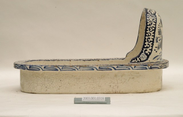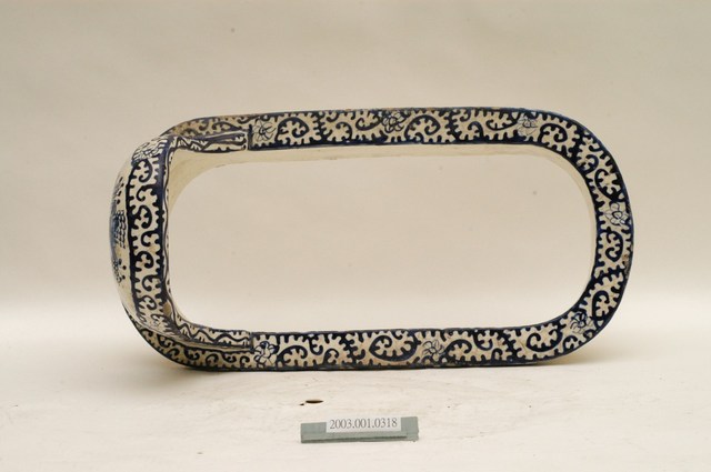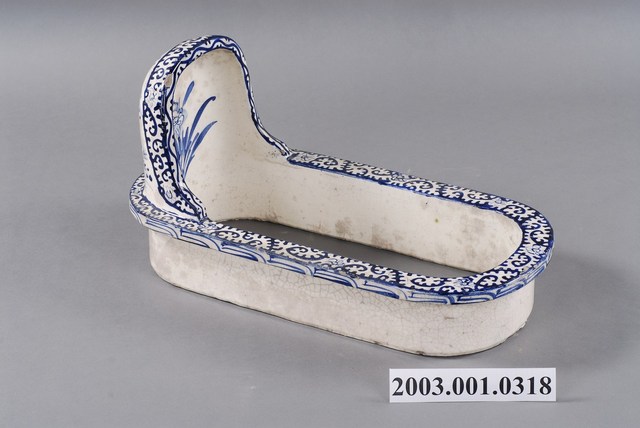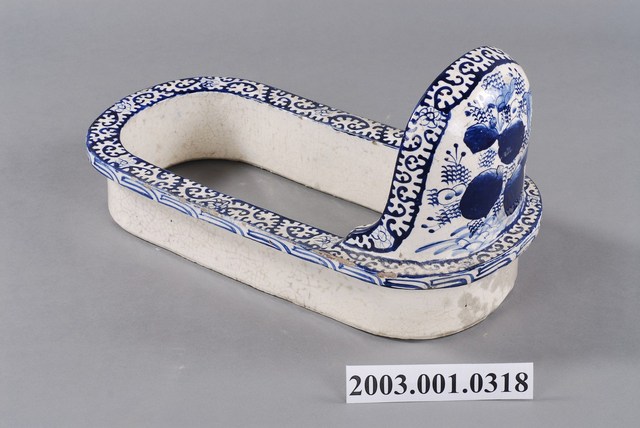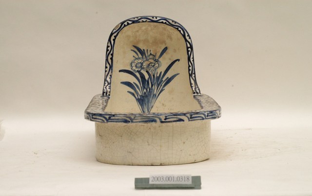 1.此為青花瓷馬桶,器長55.2公分,寬27.3公分,高28.6公分,器身呈小判型,中間底部簍空,瓷土燒製而成。短側邊有半圓形內凹山牆,頂部口緣以雲紋及草紋裝飾,與器身相連處有左右雙翼。山牆內側立面為花草紋,上半部有大片髒污,外側立面為花草紋及鳥紋,輔以魚鱗紋做底。器腹四邊向外折沿,圍繞藤蔓紋與回字紋,兩側長邊外緣有部分落漆破損。此器整體皆上白色瓷坯,以藍鈷青花繪製圖案,底座立面內外皆有開片裂紋,整體有部分破損情形。2.青花瓷馬桶,作法是將氧化鈷繪於白色瓷坯上,燒製成藍色圖案的釉下彩瓷器,常以花草紋、水波紋裝飾,較陶製馬桶更顯高雅。青花瓷馬桶初期多來自日本,後期才出現臺灣工廠生產的款式,使用時將馬桶裝設在已挖好的糞管(坑)之上,器底簍空,故穢物直接掉落糞管(坑) 中,近似現代蹲式馬桶。此種設計與日治時期引進現代化公共衛生政策相關。