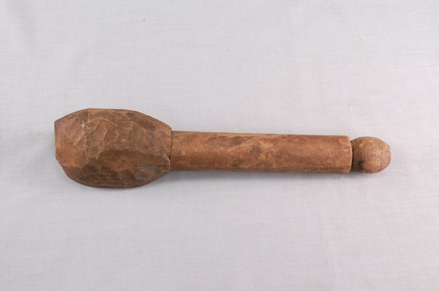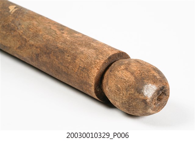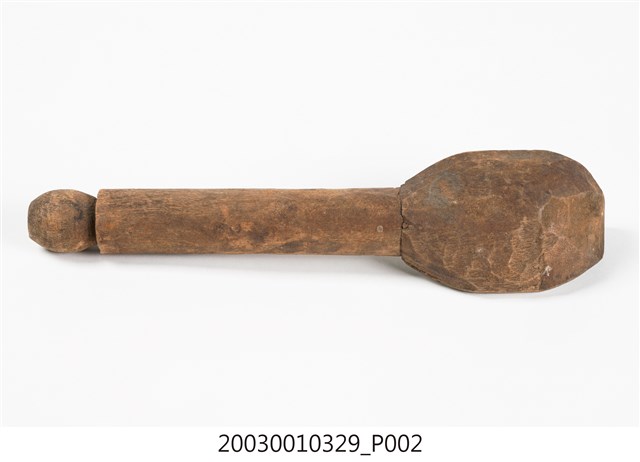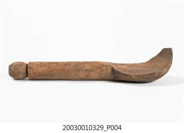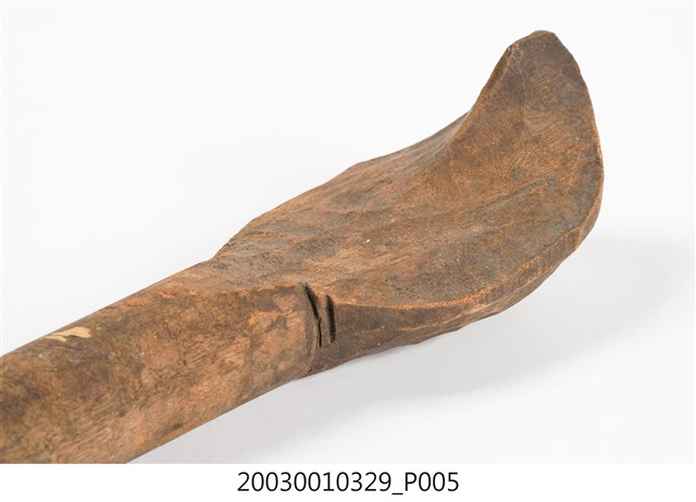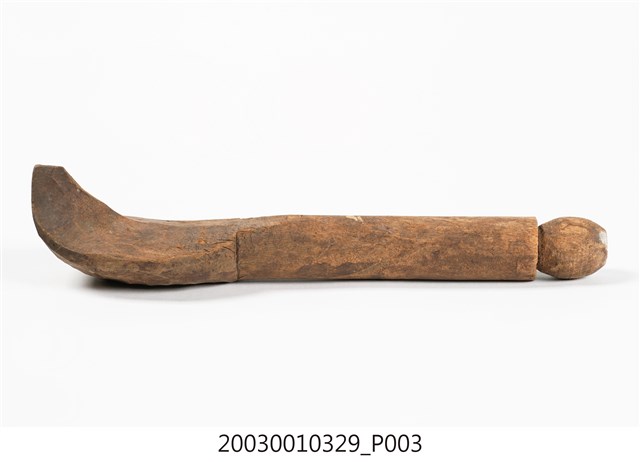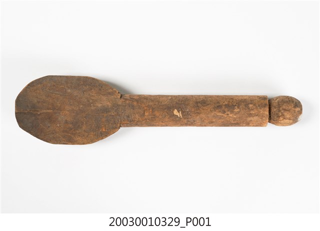 1.本件木匙係由整塊木頭一體成型雕刻而成,長30.9cm、寬7.5cm、高6.4cm。頗有厚重感,色澤呈現黃褐色,質地較為粗糙,前端椀部略呈橢圓,柄部較直為圓柱型,柄部尾端為一圓球型雕刻。柄部於椀部之間平行無曲度,椀部兩側邊緣亦呈平行無法盛裝液體,整體看似接近飯匙的形制,前端有一突起可能便利挖勺食物。本件造型樸質,著重其實用性功能未有其他雕刻裝飾。2.臺灣原住民族的日常飲食器具以天然材質製作為多,如竹、椰殼等。本件所屬族群不詳,一般來說,若為排灣族或魯凱族使用之木匙,常見柄部帶有雕刻,將飲食器具呈現出藝術美感。由於本件長及30公分,大於一般個人使用之木匙,可能作為舀飯菜之公匙。