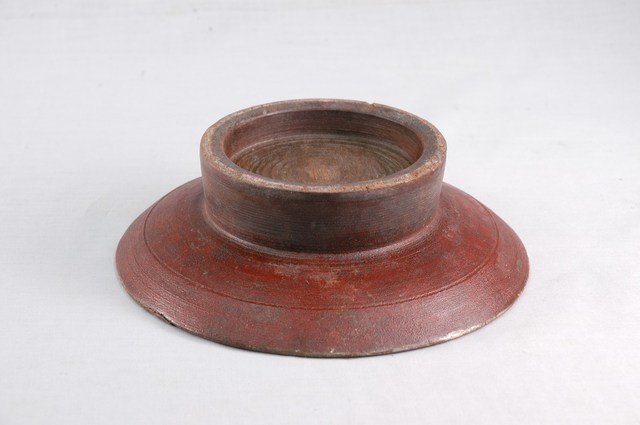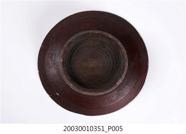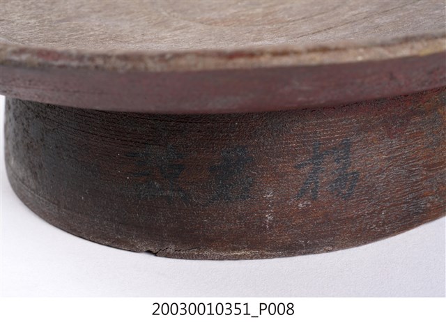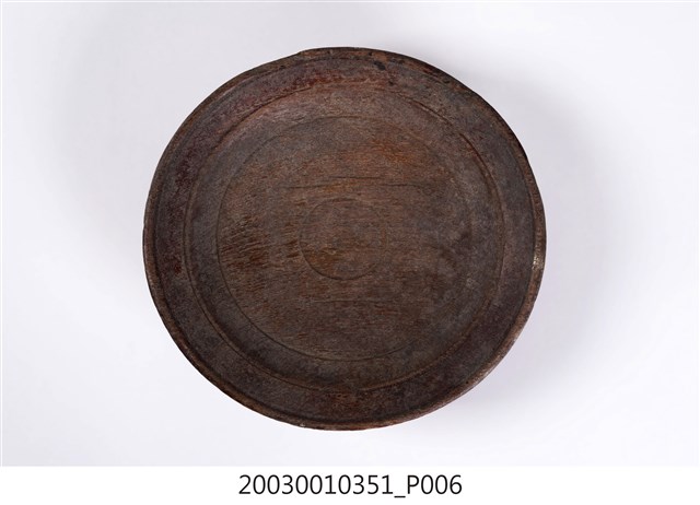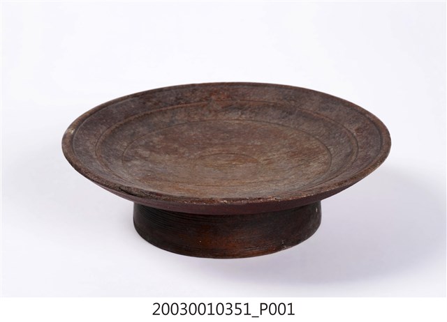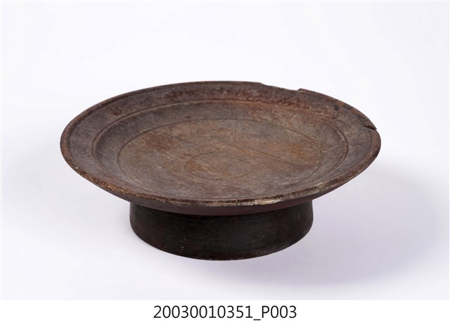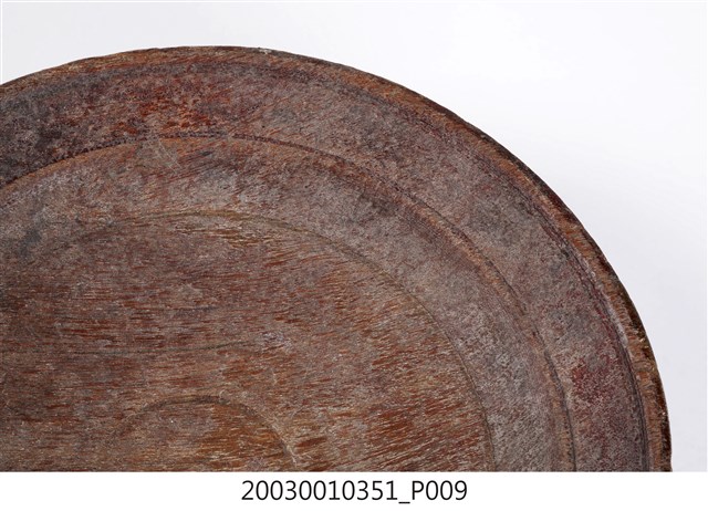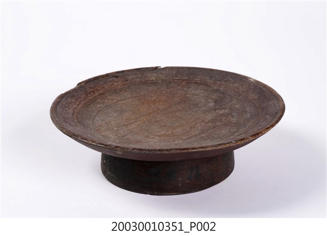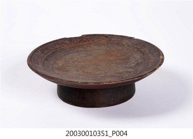 1.本件高腳供盤以單塊木頭刨削雕磨出一體成形的圓形木製盤子,整體結構完整,雕工簡單、樸拙。盤正面由外至內雕有四道圓線紋作為裝飾,背面有一道圓線紋裝飾,底部為中空圈柱狀的高足。整體外側塗有棕色漆,用以防蛀。因經久使用與保存不佳,正面的棕漆已明顯脫落褪色,露出內部的木胎,佈滿刮痕且盤緣處有明顯磨損與破損;背面與圈足的漆則有些許斑駁脫落及褪色,底部外緣明顯磨損,圈足的邊壁外側有以黑漆書寫的使用者名稱,圈足內部呈現多道由機器刨磨製成的痕跡。2.此類木料材質的高腳供盤又稱「豆盤」、「四果盤」。是臺灣早期社會在祭祀、節慶、下聘時置於供桌上用來擺放供品的器皿,供品通常是粿粄、水果、糖果蜜餞等,擺設時大都會放置以三至五盤為主。隨著時代發展,高腳供盤逐漸出現銅製、鋁製、不繡鋼製、塑膠製等,時至今日,常見的多為紅色塑膠材質。