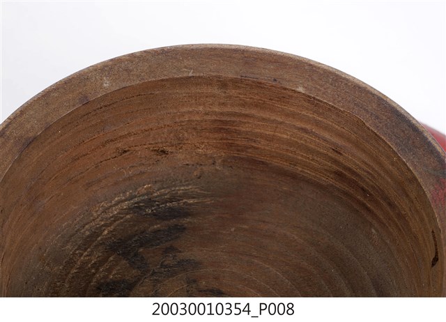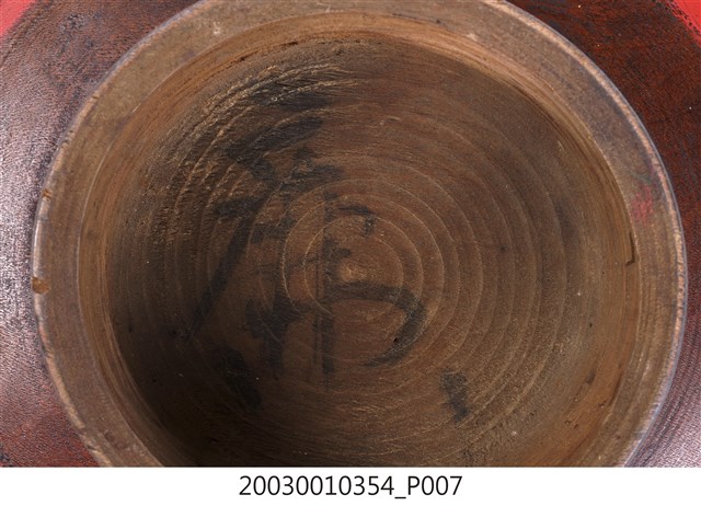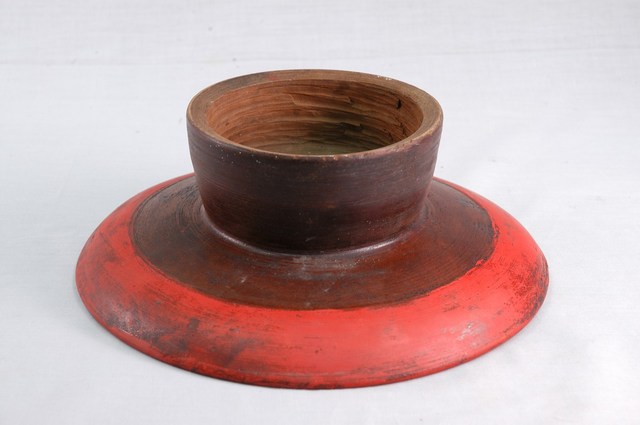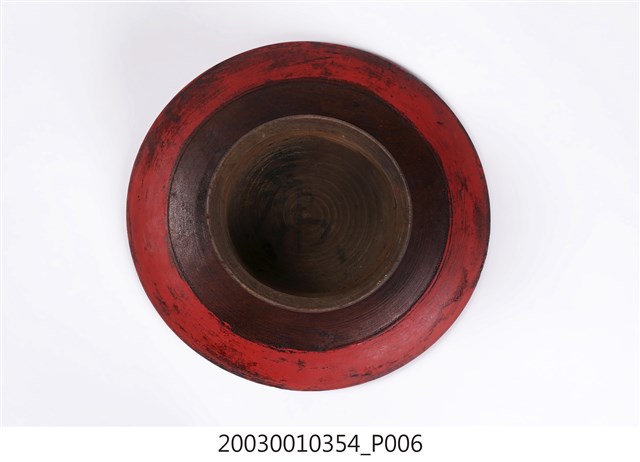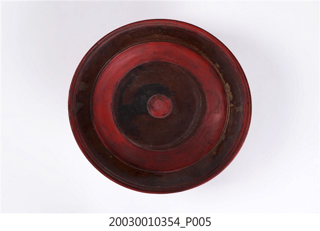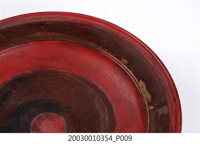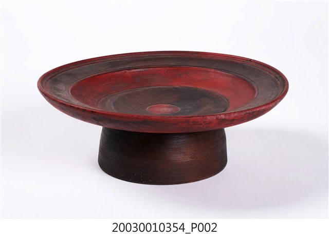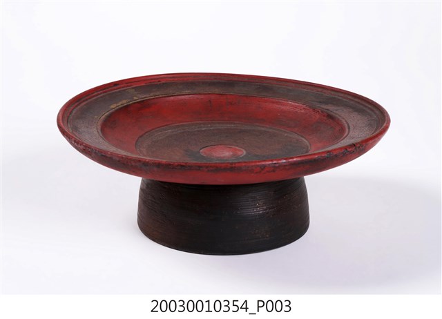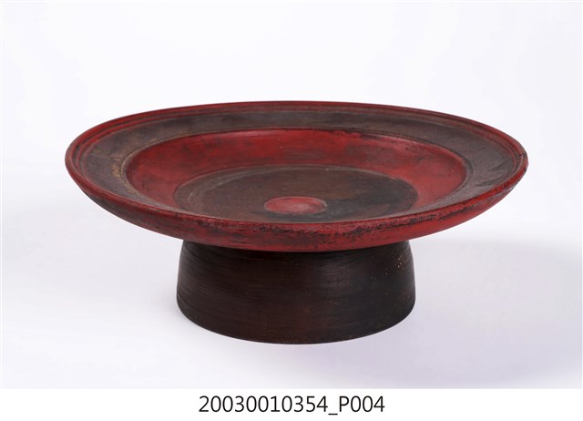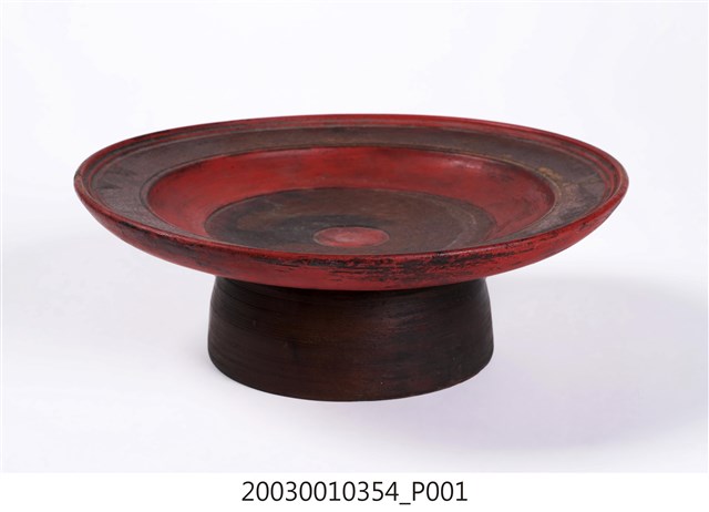 1.高腳供盤以單塊木頭刨削雕磨出一體成形的圓形木製盤子,整體結構完整,雕工簡單、樸拙。盤正面由外至內雕有五道圓線紋作為裝飾,形成盤面有五個同心區塊,背面有一道圓線紋裝飾。底部為中空圈柱狀的高足,周徑由盤面漸向足底擴大,以增加穩定性。正面第一(口緣)、三、五(盤心)的同心區塊,以及背面口緣處塗有紅色漆,其餘的部分塗棕色漆,形成一種塗彩設計的美感,但皆已明顯的褪色,盤面與邊緣處有些微磨損。此件保存狀況尚佳,正背面底部有些許黑色汙漬沾染,圈足內部呈現多道由機器刨磨製成的痕跡。2.此類木料材質的高腳供盤又稱「豆盤」、「四果盤」。是臺灣早期社會在祭祀、節慶、下聘時置於供桌上用來擺放供品的器皿,供品通常是粿粄、水果、糖果蜜餞等,擺設時大都會放置以三至五盤為主。隨著時代發展,高腳供盤逐漸出現銅製、鋁製、不繡鋼製、塑膠製等,時至今日,常見的多為紅色塑膠材質。