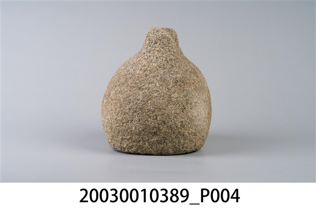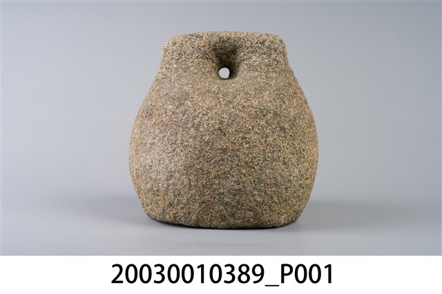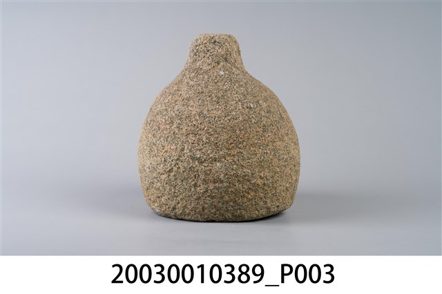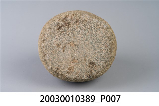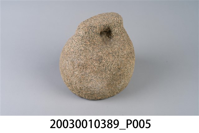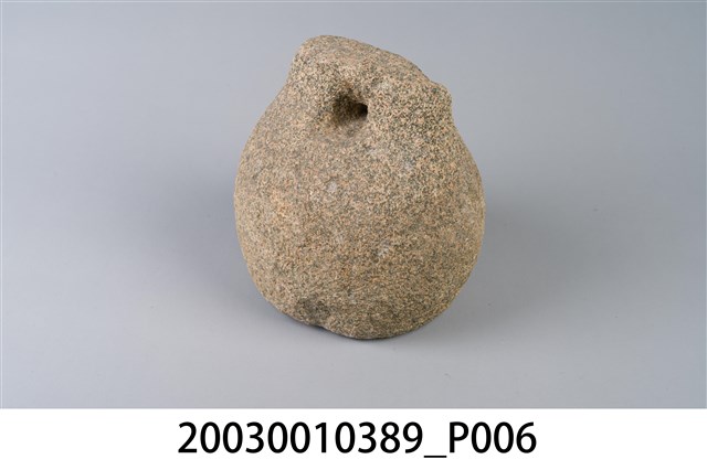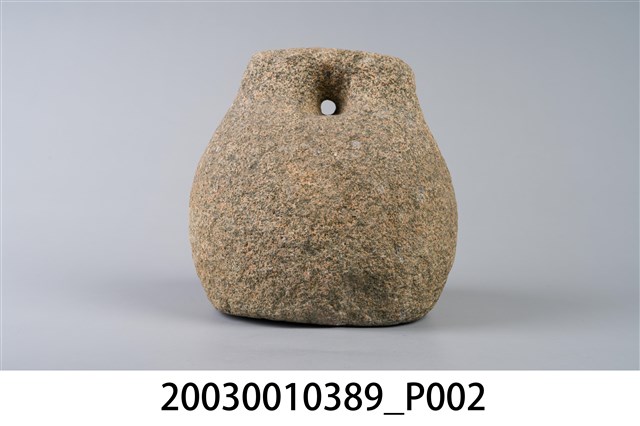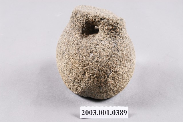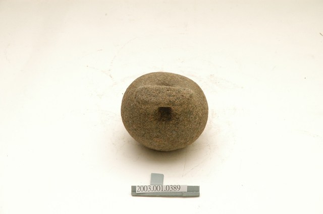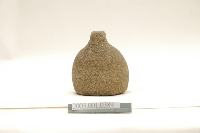 1.本物件為石製秤錘,用圓形石頭雕製成錘狀,一體成型,錘頂略呈扁平狀,鑿有1個圓孔可綁繩子。