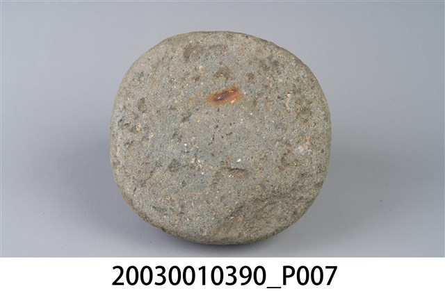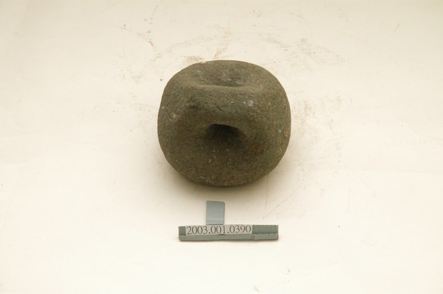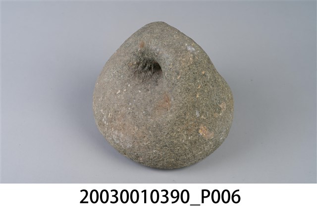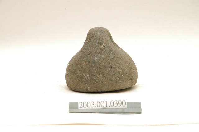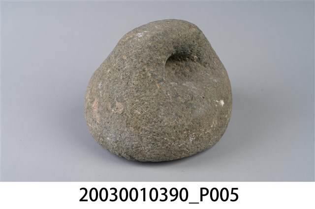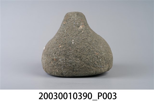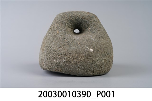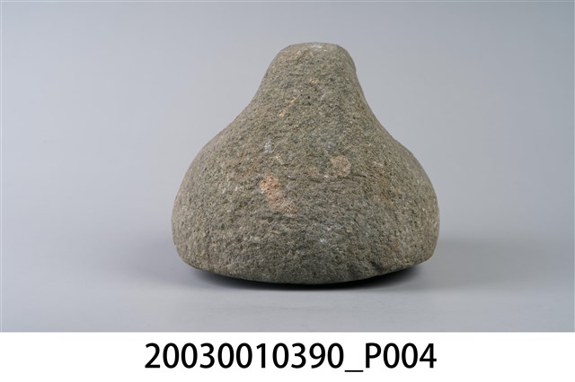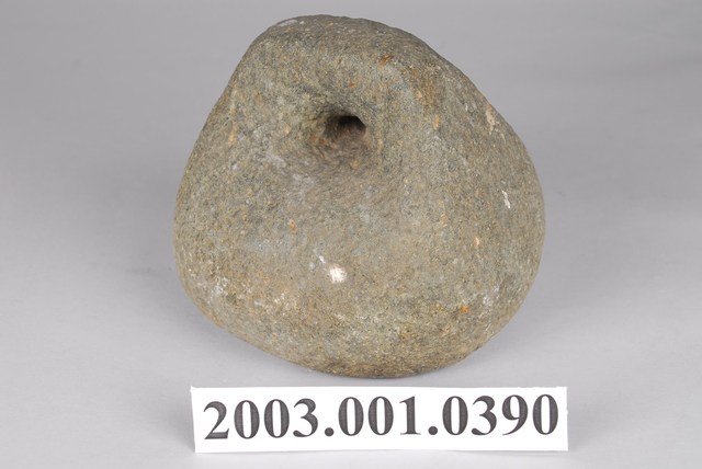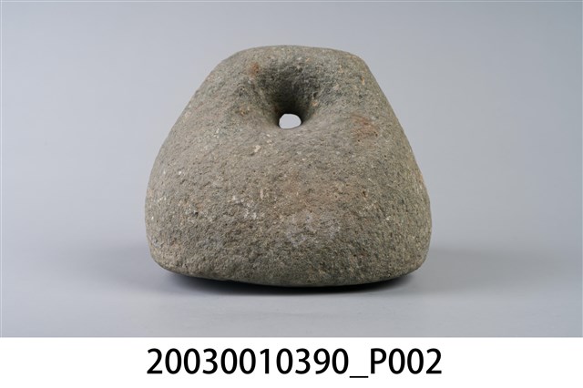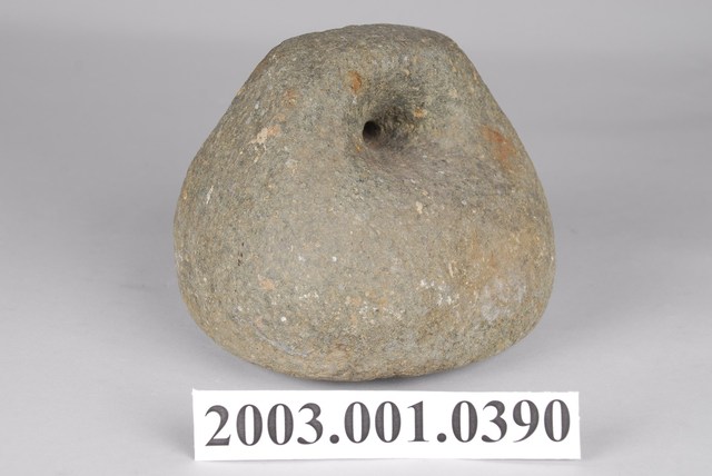 1.本物件為石製秤錘,用圓形石頭雕製成錘狀,一體成型,錘頂略呈扁平狀,鑿有1個圓孔可綁繩子。