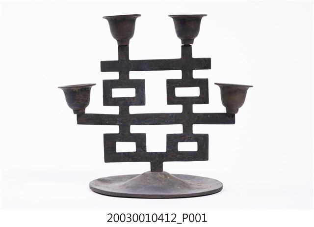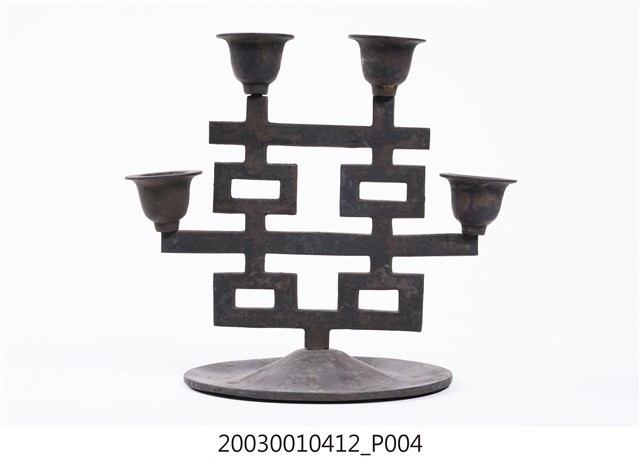 本件錫製4盞形囍字燭臺,主要使用於婚禮壽宴等慶祝囍事場合才會使用。通身以錫金屬製作而成,可分為承盤、承柱與底座3部分。底座呈圓盤狀,中央作錐狀突起,周圍略帶凹陷。承柱以厚錫片製作「囍」字體板,於囍字兩側頂端與長橫筆畫之兩端接固定有承盤。承盤作深杯型,口緣作折沿平口,底部帶有圓形圈足。