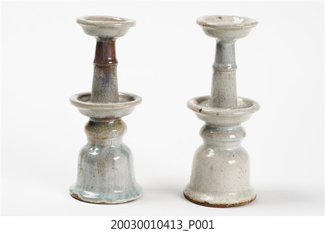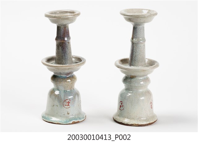 1.灰青釉冰裂紋燭臺組為2件成對之燭臺,其形制相同,釉色略帶差異,但均有冰裂紋開片。形制作上下2承盤設計,由於頂端承盤中心處有一圓形透孔貫穿燭臺底部,因此無法做為油燈使用,主要用來放置斗燭使用的燭臺。2.蠟燭為早期臺灣傳統的生活照明用具,隨著煤油進入後,臺灣民眾逐漸改變使用習慣。但因燭臺與斗燭為傳統祭祀的供具之一,因此並沒有因為新的照明燃料而消失。傳統燭臺可分為實用器與祭祀器2大類,實用器不限單雙數,外觀較為樸實。祭祀器則以成對出現,裝飾較為精美,部分燭臺會於器表製作吉祥如意相關字樣與造型。