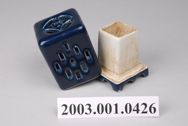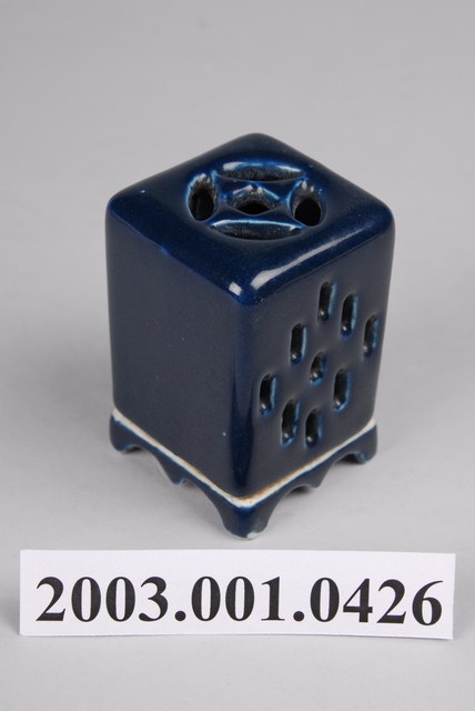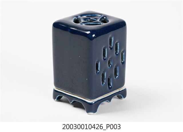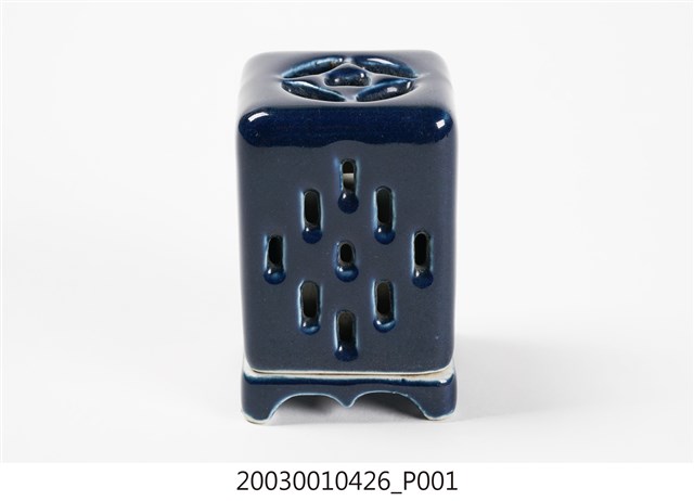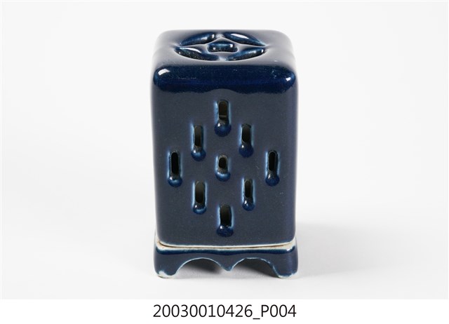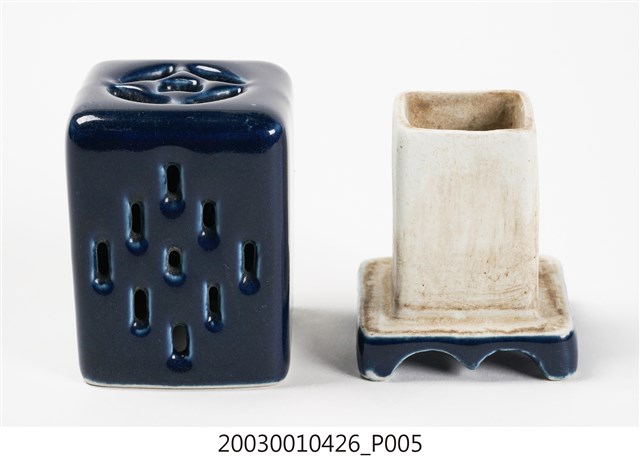 藍釉燈閣組可分為外罩與燈座2部件,其形制為方型體,表面作鏤空設計。藍釉僅施於外罩器表以及燈座底足部分,其餘皆呈素面米白胎體。該類形制之器物主要用於降低照明亮度,多為夜間就寢使用,如現代夜燈。可分為燈罩式與燈閣式2大類,燈罩式為單件,可於其他適合之燈座蓋上即可。燈閣式則是整組燈具多為2件式,有外罩與燈座部件。
