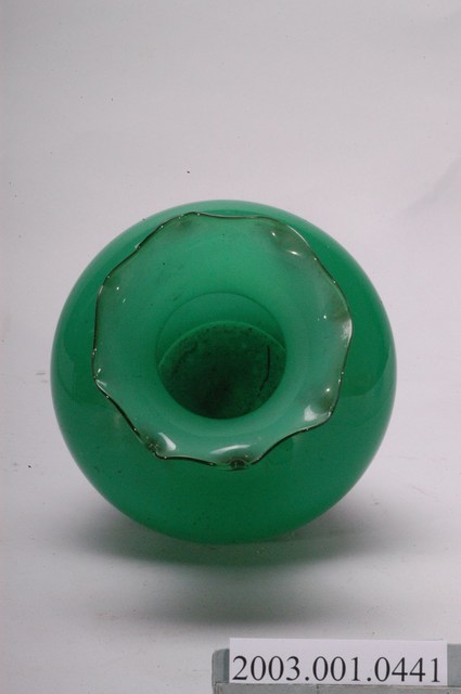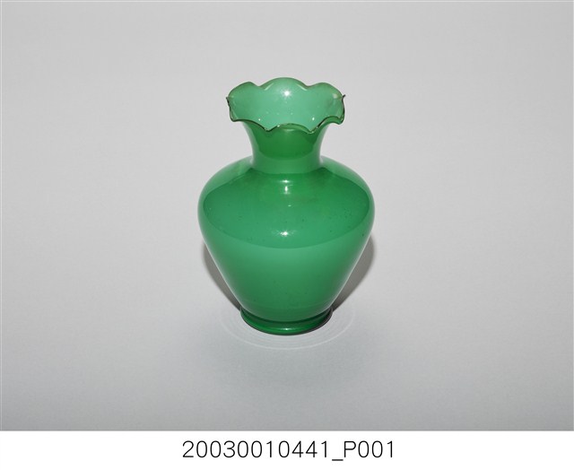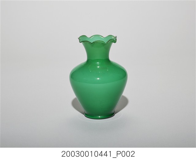 1.本件綠白雙色玻璃花瓶長12.1公分,寬12.1公分,高16.5公分,整體以玻璃製作而成。器身採套料工法以手工吹製呈現外層綠色,內層白色之雙色素面花瓶,口沿外侈作荷葉邊裝飾,頸部呈上寬下窄之束頸狀,斜折肩,腹部作上寬下窄樣式,底部呈平底,邊緣帶唇。2.臺灣玻璃工業主要發展於日治時期,由於新竹地區產有天然氣以及製作玻璃所需的矽砂,在1929年設立高級玻璃株式會社,民間也於新竹當地設立小規模工廠,大量生產日常所需之玻璃製品,新竹成為臺灣玻璃製造的重要產地。