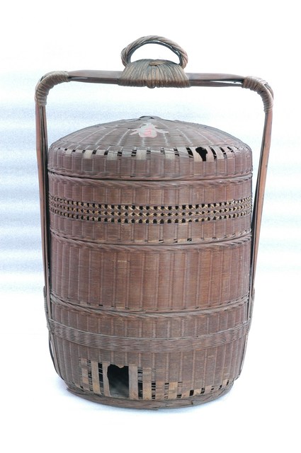 本件為竹編3層𣛮籃含上蓋,採用臺灣民間容易取得的竹子剖成竹片、竹篾、竹絲,再用竹片、竹篾為支架,以篾條或篾皮交互編織3層圓形壁體。提梁耳的正上方中間有1個圈孔,方便插入扁擔或棍棒2人扛抬。提梁耳的側邊書寫「楊醫院」,應為此件擁有者。上蓋和底層略有破損。𣛮籃和上蓋皆未上漆或彩繪。𣛮籃是傳統民間重要的盛物容器,可裝蔬果食物等物品。