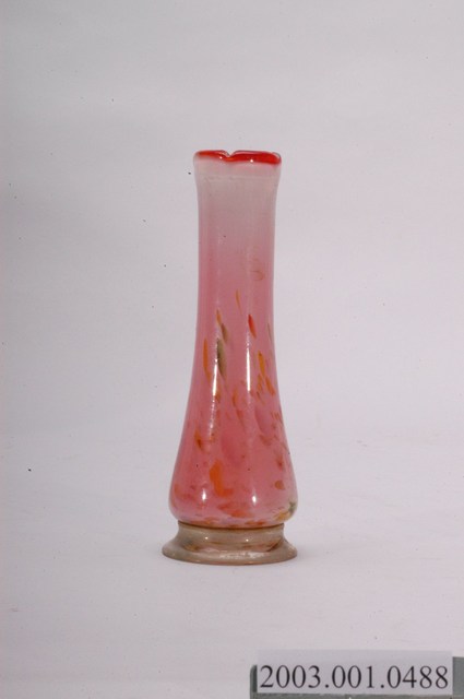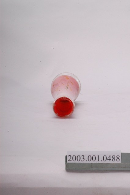 1.本件白紅雙色攪料玻璃花瓶長6.5公分,寬6.5公分,高19公分,整體以玻璃製作而成。器身採套料工法形成外層白色,內層紅色之雙色玻璃器,於器表另外使用攪料工法,即為以多種不同色彩的玻璃熔化混合,以呈現斑點紋路。花瓶採手工吹製,表面帶有黃、紫、橘、綠與紅色斑點,器型呈長直圓筒狀,於接近器底逐漸寬大,口緣作葵口,器身呈平底,下接圓形中段束腰底緣外僘之圈足。2.臺灣玻璃工業主要發展於日治時期,由於新竹地區產有天然氣以及製作玻璃所需的矽砂,在1929年設立高級玻璃株式會社,民間也於新竹當地設立小規模工廠,大量生產日常所需之玻璃製品,新竹成為臺灣玻璃製造的重要產地。