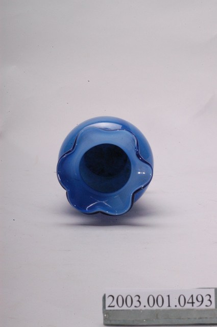 1.本件藍白雙色玻璃花瓶長8.8公分,寬8.8公分,高16.7公分,整體以玻璃製作而成。器身採套料工法以手工吹製呈現外層藍色,內層白色之雙色素面花瓶,部分玻璃較為厚實部分呈現深藍色澤。花瓶口沿外侈作荷葉邊裝飾,頸部寬短,續接滑肩,器腹作上寬下窄樣式,底部下接底緣外僘之覆盞型底足。2.臺灣玻璃工業主要發展於日治時期,由於新竹地區產有天然氣以及製作玻璃所需的矽砂,在1929年設立高級玻璃株式會社,民間也於新竹當地設立小規模工廠,大量生產日常所需之玻璃製品,新竹成為臺灣玻璃製造的重要產地。