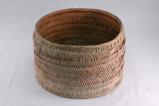 1.本件竹編什細籃,為寬圓桶造型的竹籮筐,使用粗細兩種竹篾條以斜交相編法編織而成,經、緯篾片密接無間隙,是本省客家庄婦女慣用的什細籃形式,籃身較閩南式的略高,什細籃邊緣及底邊以細竹條纏繞保護,通體找不到竹條收尾處接頭,製作極為細緻。2.什細籃通常形似臉盆,用來盛放婦女使用的針線衣料等什細。臺灣因竹材取得容易,臺灣原住民及明朝起移入的漢人已有自製實用的日常竹器用品,隨後陸續有竹製品從中國輸入販賣,至清朝光緒初年,已有臺南竹仔街、嘉義竹街、鹿港竹篾街等竹材、竹器店聚集成市的形成。
