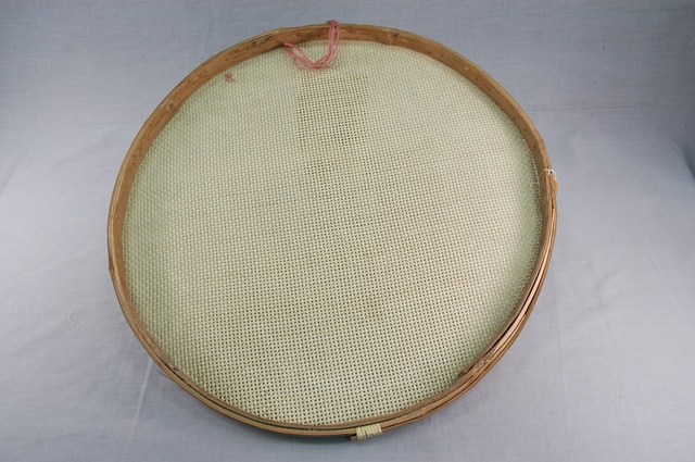 1.八卦米篩,為迎娶新娘時所用的竹編米篩,以藤篾採壓一挑一的四角孔編法編成圓形體,周圍上彎起邊,用粗竹片繞圈夾住竹篾,再以竹釘固定唇口,接合處以藤篾包紮緊固。底面部分以紅色顏料繪製特定的圖案,最中間為「太極」字樣,向外為八卦卦爻,再向外一圈為八個箭頭與「天定良緣添丁進財」八個字交錯排列成一圈,最外緣的部分是右左各為龍鳳,上方為一「囍」字,下方為一火球圖案。本物件篩面呈現奶白色澤,篩孔相當細緻,整體仍相當完整,但紅漆圖案已有些許脫落。紅色「囍」字旁穿綁一紅色塑膠繩,做為簡易的吊掛收納之用。