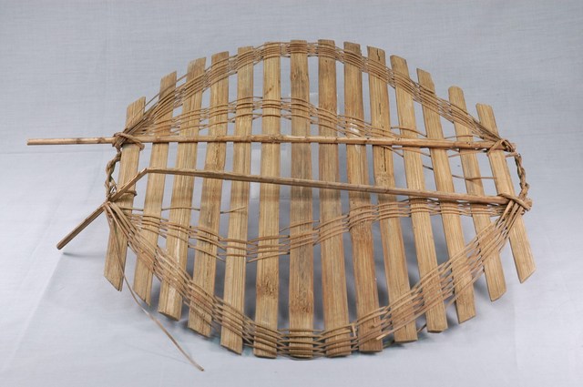 1. 以竹條與細竹篾,依鍋子內緣大小編製而成的圓形蒸架。最底部為兩條橫向的等長細竹條,其上再以十四條竹片以相等間距縱向排列,製成圓形;縱向竹片間只以四條細竹篾在兩橫向細竹條位置區上下交錯編織成條狀;兩橫向竹片間則以細竹篾交叉編織,外緣以六條細竹篾上下交錯編織成圈狀;兩橫向細竹條的一端較突出,應是為方便拿提之用。因使用頻繁與年代久遠,竹條與竹篾上的光澤已嚴重脫落,有一根橫向竹條已凹折,以及編織的細竹篾多處脫落的現象。2. 早年以傳統大灶蒸煮食物時會以這種蒸片架在大型蒸籠或蒸桶中,蒸片上放置要蒸的食物菜餚,竹片間有空隙以利蒸氣通過,利用下方沸水發出的熱蒸汽來蒸熟或蒸熱食物。蒸籠或蒸桶可以單一使用或疊架的方式,一層放一個使用。竹製蒸片有不易附著水珠的好處,並且易乾,不用時往牆頭一掛,很快就自然風乾,深受主婦愛用。此類蒸片在臺灣民間有許多不同的名稱,如蒸架、蒸篦、粄篦、竹簝仔、粄簝仔等。此種蒸片是早年在臺灣民間有許多不同的名稱,如蒸架、蒸篦、粄篦、竹簝仔、粄簝仔等。