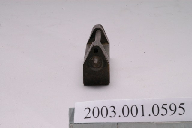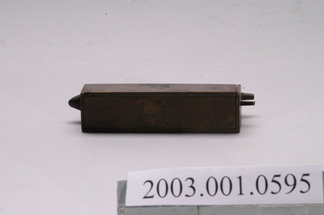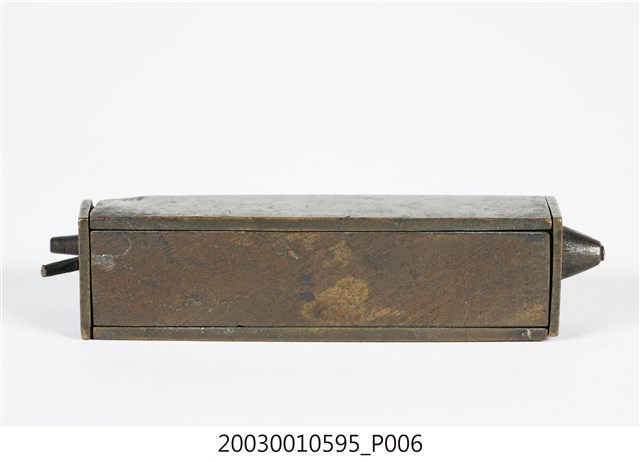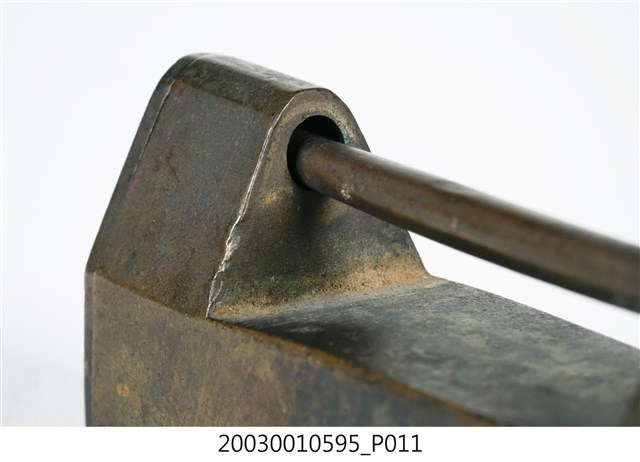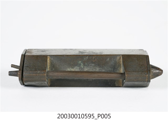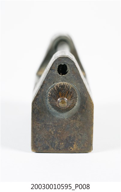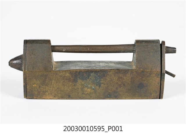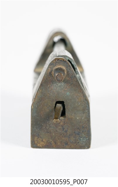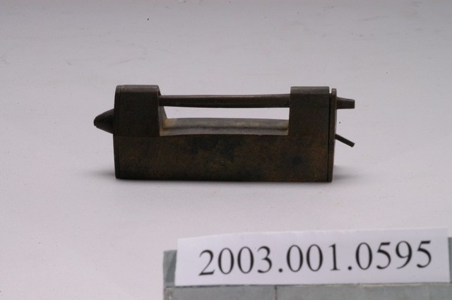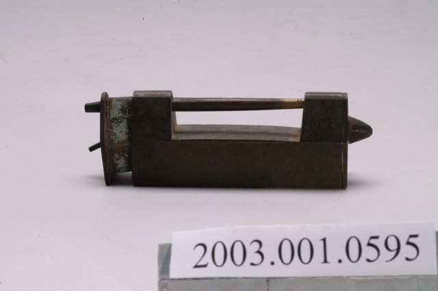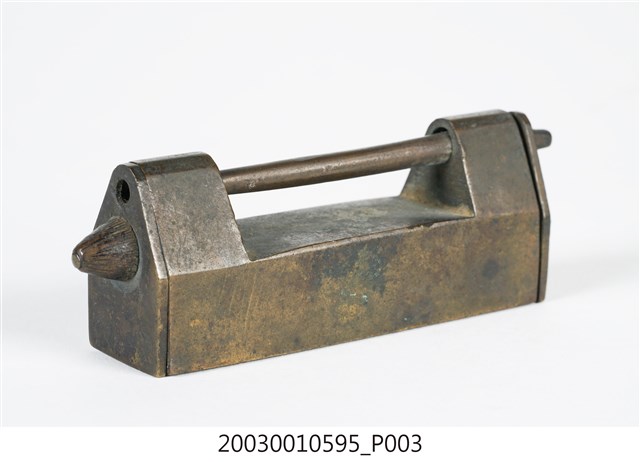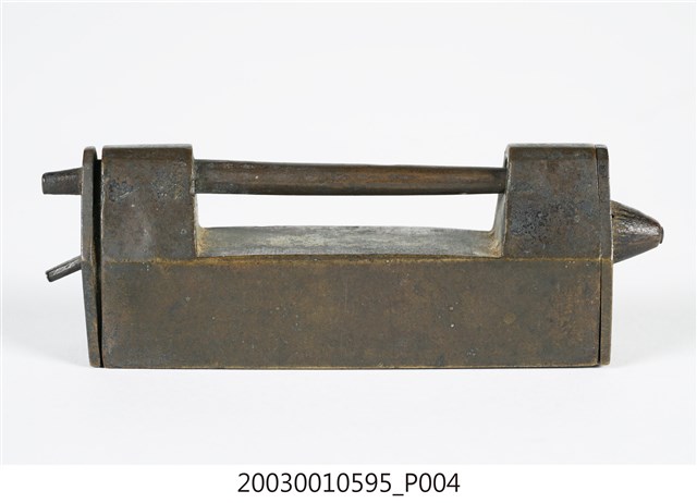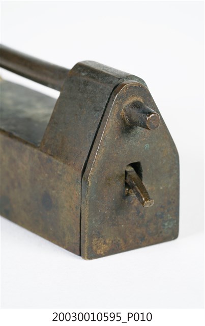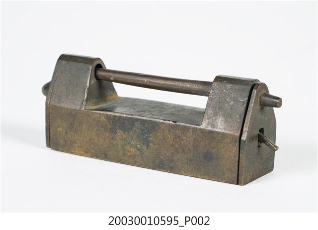 1.紅銅製橫式鎖具,又稱「廣鎖」,鎖頭上部呈三角形,下部呈正方形,外觀有氧化的現象。本件鎖頭一側有洞,插有銅棒,另一側有凸起的三角錐。2.金屬鎖的大量使用始於東漢,分為簧片構造鎖與文字組合鎖兩大類,常用於鎖門、鎖櫃、鎖箱、…等。簧片構造鎖構造分為鎖樑、鎖栓、彈簧片、鎖梗、鎖體、鑰匙。